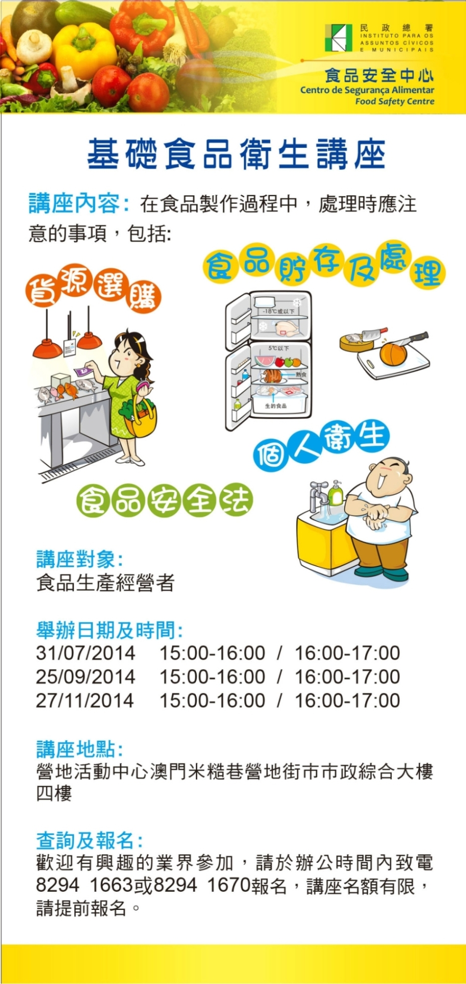 民政總署食品安全中心為持續提升本澳食品行業的食安水平,將逢單數月份舉辦例行的業界食安講座。首次講座定於七月三十一日(星期四)在營地街市四樓營地活動中心禮堂進行,歡迎食品行業人員踴躍報名參加。
