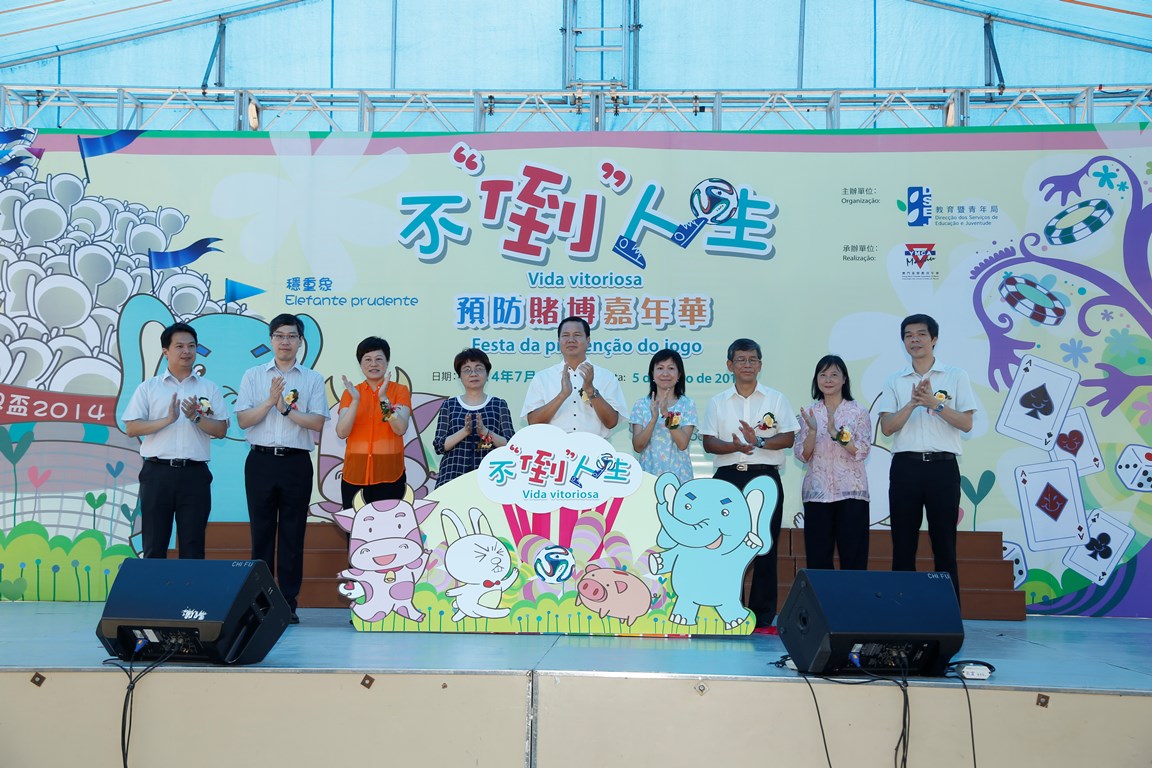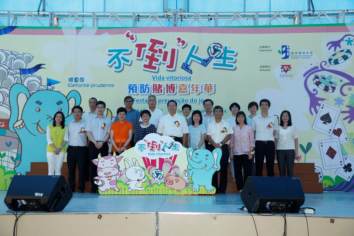 “不‘倒’人生——預防賭博嘉年華”由教青局主辦,澳門基督教青年會承辦。活動內容豐富,其中 “舞台匯演”共11所學校的中、小學生超過100人參與才藝演出,包括濠江中學、化地瑪聖母女子學校、高美士中葡中學、嶺南中學、澳門浸信中學、教業中學(分校)、菜農子弟學校、海暉學校、利瑪竇中學(中學部)、澳門大學附屬應用學校和培正中學。學生以健康的才藝演出帶出在誘惑前要懂得正確的選擇,透過發掘潛能,實現自我增值。現場還設有4個遊戲區:“升呢體驗區”的“盤球九宮格足球射龍門”最受一家大小喜愛。市民紛紛挑戰自己最多能射到多少格,場面熱鬧,充分體現“齊踢波,笑呵呵”的樂趣;“ T-裇設計”也十分吸引,有些市民現場穿著即時設計的預防賭博T-裇,盡顯拒絕賭博由自己做起的態度。“周圍睇表演區”讓整個嘉年華現場氣氛更加高漲,街頭魔術、花式單輪車、街舞、踩高蹺等表演不時在場內進行,吸引市民圍觀,鼓勵青少年朋友多參與康體活動,發展多元興趣。“有得奬展板區”以漫畫故事讓市民獲得健康理財和預防賭博的訊息,不少市民積極回答展板問題並參與抽奬。“至多FUN留影區”吸引大批市民和穩重象、勤力牛,以及不勞兔一同拍照留念,市民各具創意,裝出鬼馬有趣的踢球姿勢,喻意“踢波唔賭波”,市民還於相片上分享心聲,共同做好預防賭博的工作。