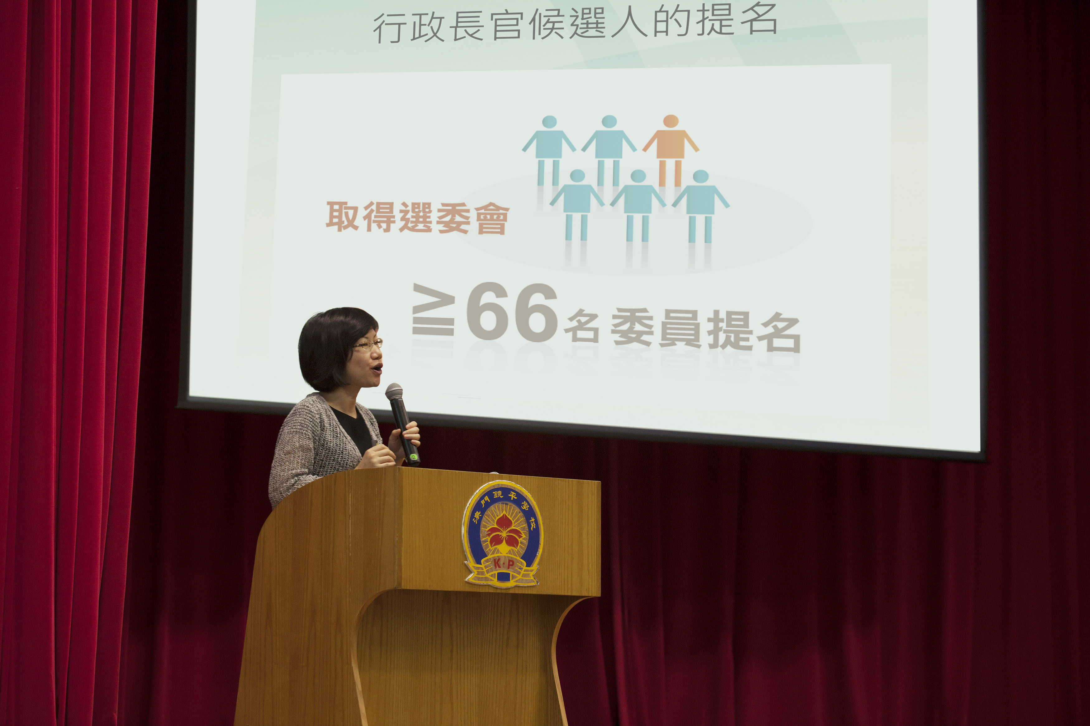 為讓學生們更清楚認識有關行政長官的產生辦法,講座中亦詳細介紹了二零一四年選舉第四任行政長官的選舉委員會的組成。例如:根據《澳門基本法》附件一的修正案,選委會由原來的三百人增加至四百人,進一步擴大選委會的代表性。而根據新修改的《行政長官選舉法》,亦適當分配選委會各界別和界別分組的委員名額,兼顧社會各階層各界別的利益以符合澳門的實際情況,實現均衡參與。此外,在選委會人數增加至四百人的情況下,行政長官候選人的提名人數由原來的五十名選委會委員增加至六十六名,以維持原規定六分之一的提名比例。