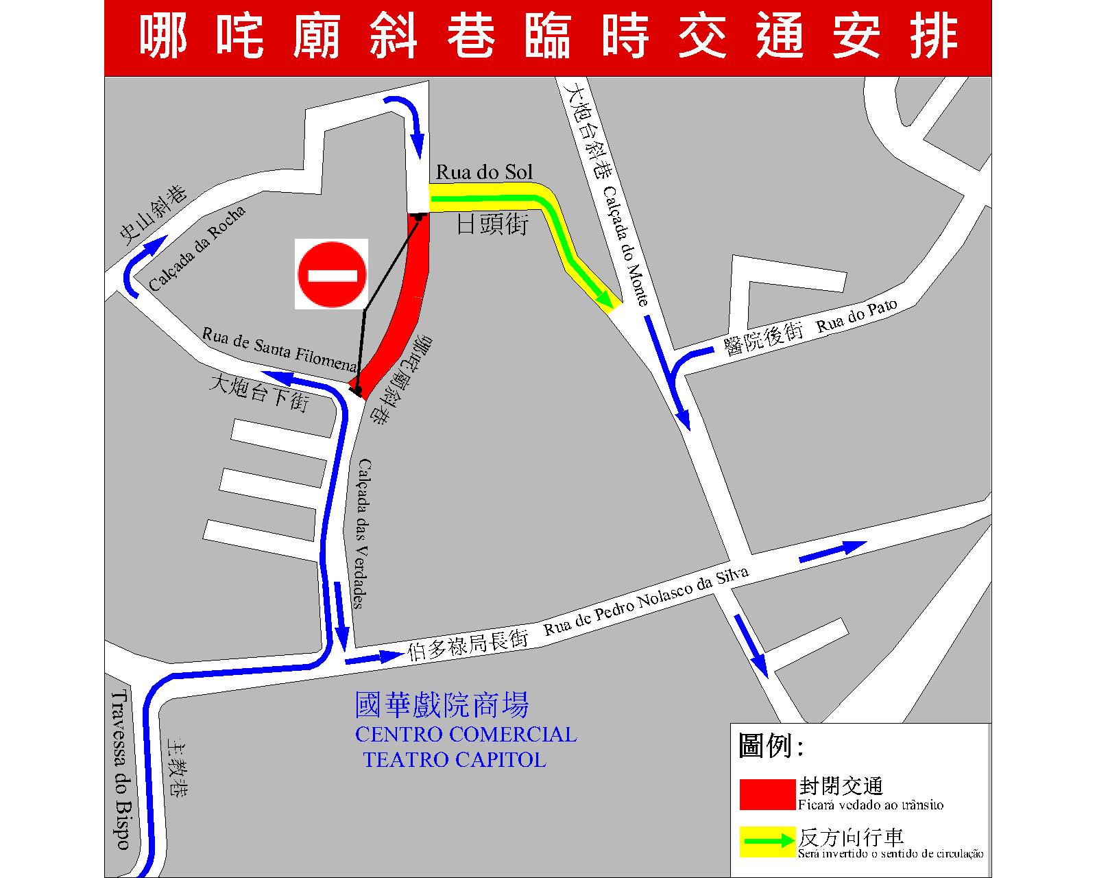 此外,工程期間,日頭街亦將臨時改作反方向行車,即車輛須由哪咤廟斜巷往大炮台斜巷方向行駛;同時禁止自大炮台斜巷及醫院後街之車輛進入日頭街;欲往哪咤廟斜巷、大炮台下街及日頭街之車輛應取道板樟堂街。