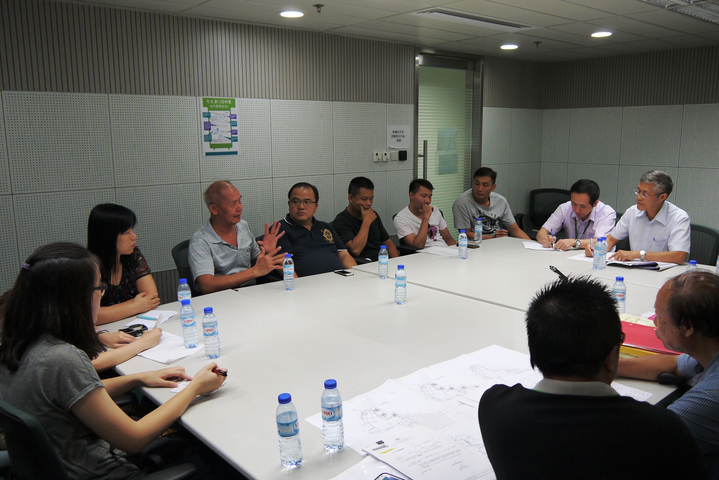土地工務運輸局城市建設廳廳長陳榮喜及相關工程師昨日(7月28日)與毗鄰該建築工程的萬新大廈居民代表和陪同居民的沙梨頭坊會理事長陸南德等,以及該建築工程業主代表、承建商代表和指導工程師舉行會議,聽取居民訴求及提供雙方溝通平台。