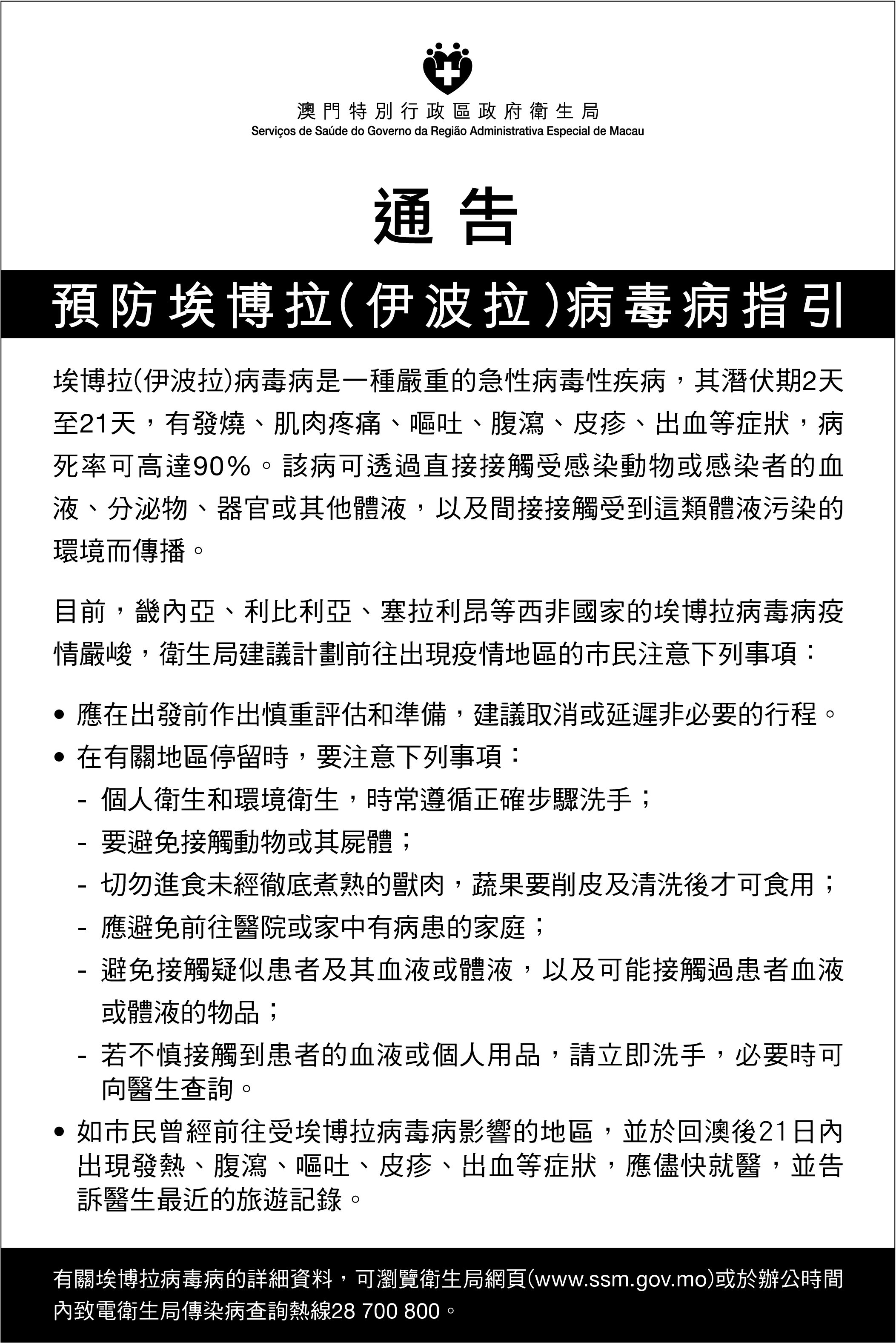 有關埃博拉病毒病的詳細資料,可瀏覽衛生局網頁(www.ssm.gov.mo)或於辦公時間內致電衛生局傳染病查詢熱線28700800。