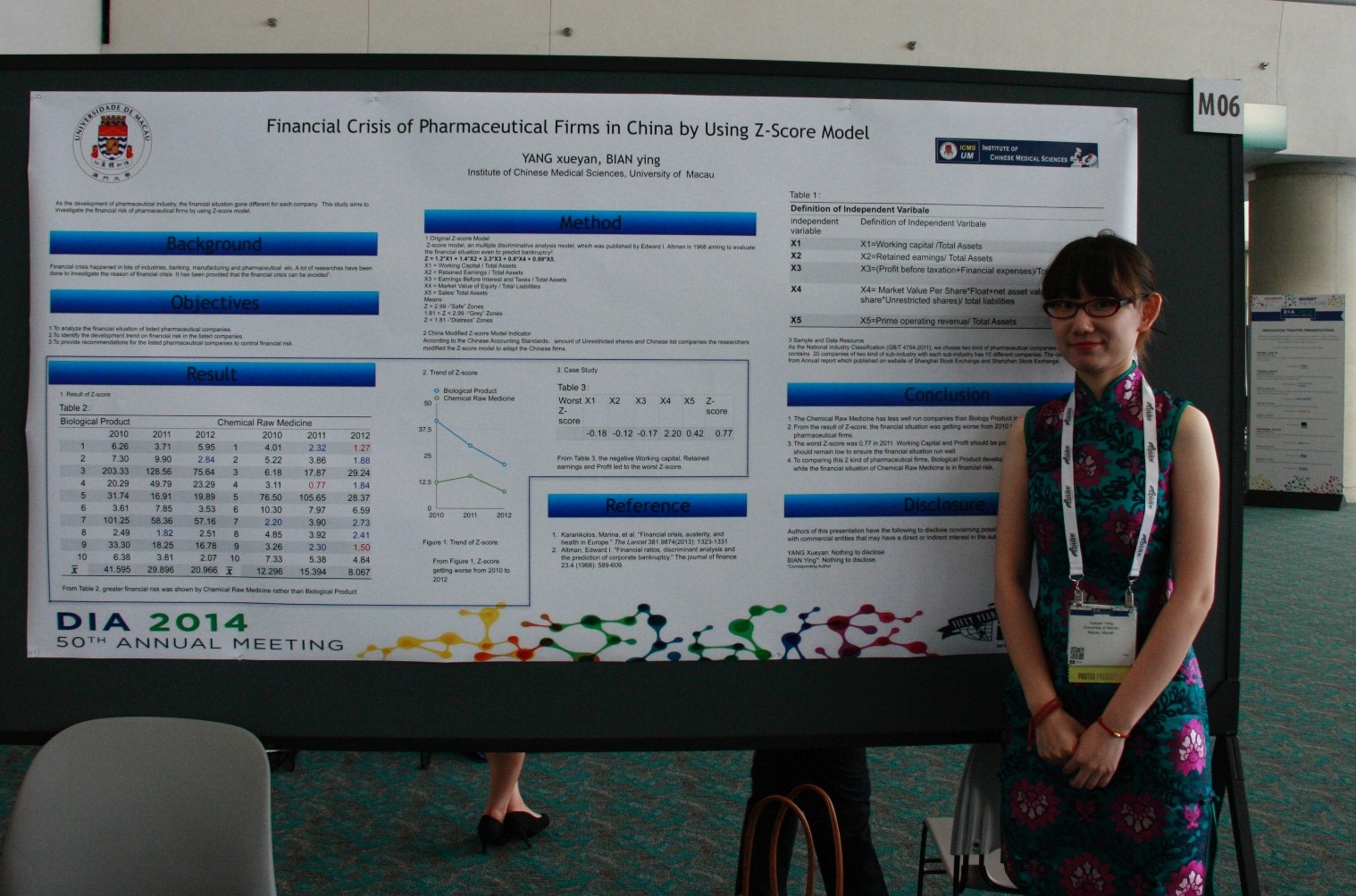 是屆DIA年會主題為“慶賀過去,發展未來”,出席者包括全球七百多間醫藥公司代表,以及七千多名來自醫藥監管機構、學術界、醫患團體等的專業人士。楊雪燕在澳大中華醫藥研究院卞鷹副教授指導下,憑著題為“通過Z值模型分析中國上市藥企的財務危機”一文,從大會收到的兩千多份學生論文中脫穎而出,獲DIA全額資助邀請出席是屆年會,向會議參加者展示研究成果。