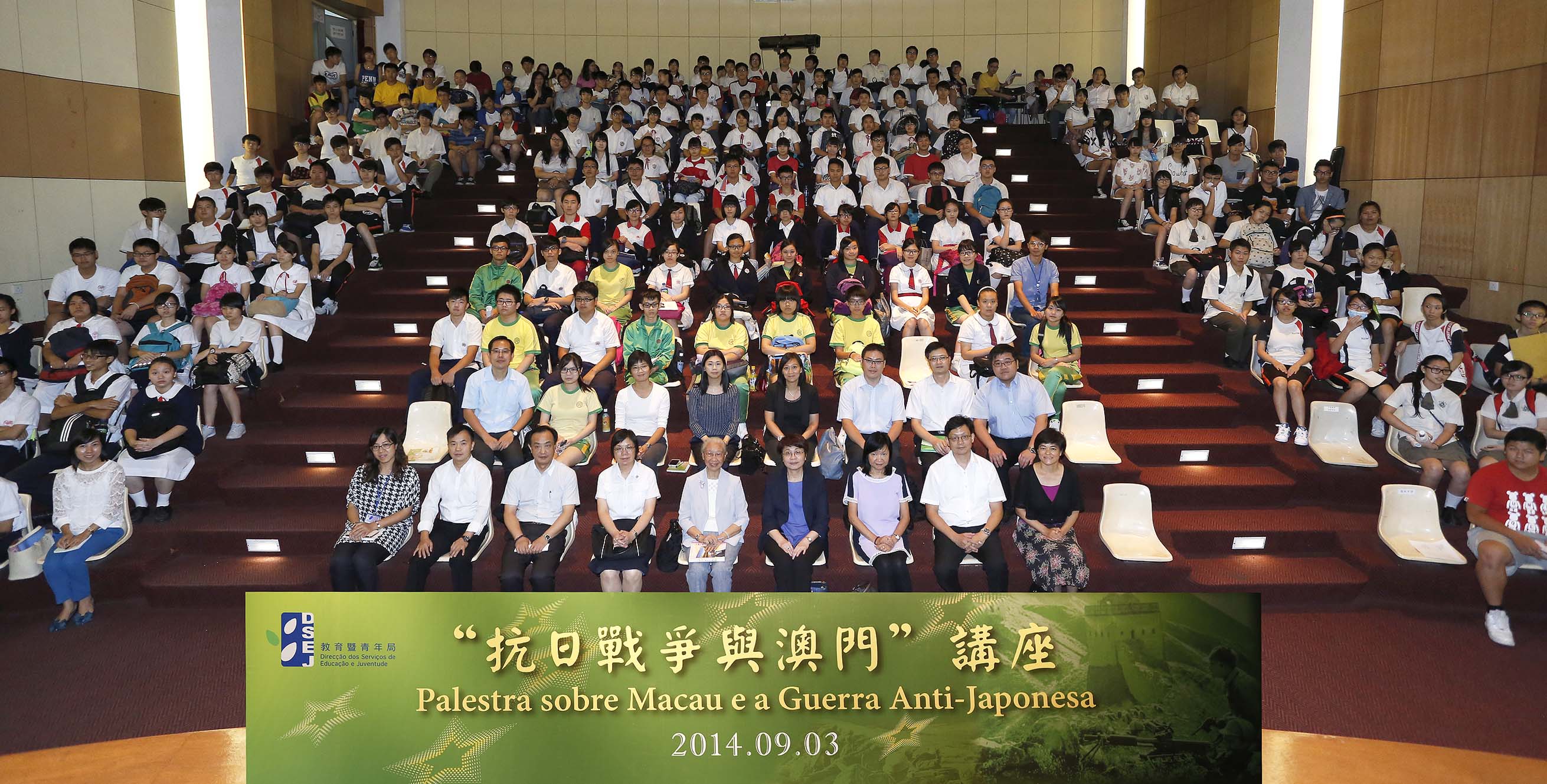 全國人大常委會於2014年2月27日下午通過了兩項決定,分別將9月3日定為“中國人民抗日戰爭勝利紀念日”,將12月13日確定為“南京大屠殺死難者國家公祭日”。為讓澳門的青少年學生瞭解澳門與抗日戰爭的關係,深刻銘記我國人民抗擊日本侵略的歷史,弘揚愛國主義傳統,教育暨青年局於9月3日在中葡職業技術學校禮堂舉辦“抗日戰爭與澳門”講座,邀請澳門資深教育工作者劉羨冰校長作專題報告。