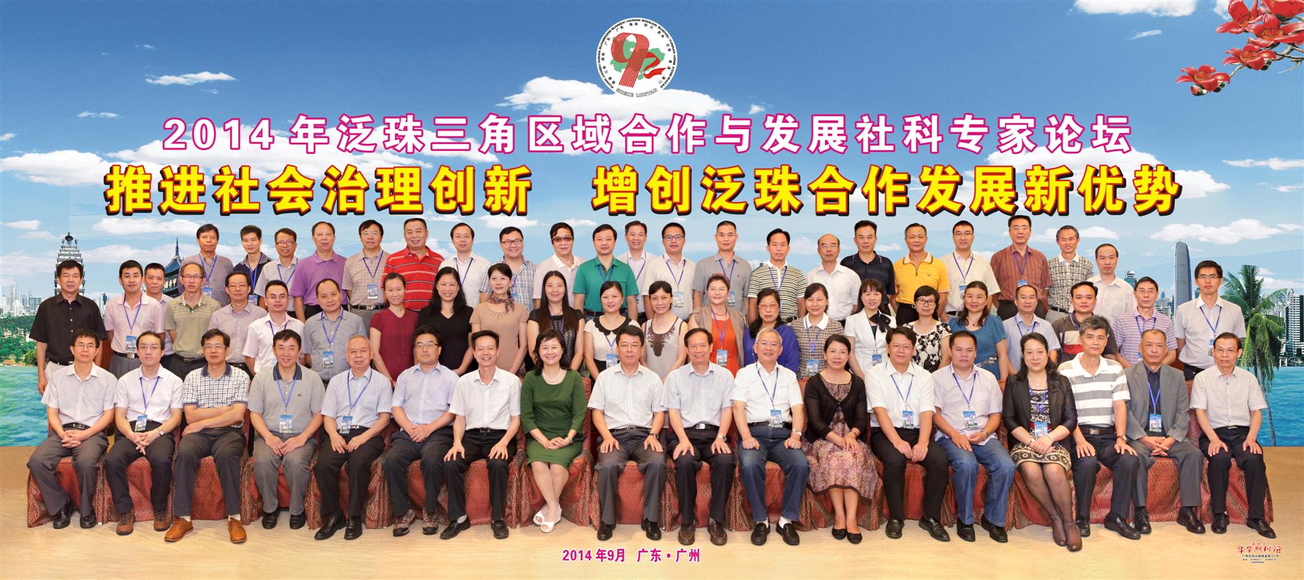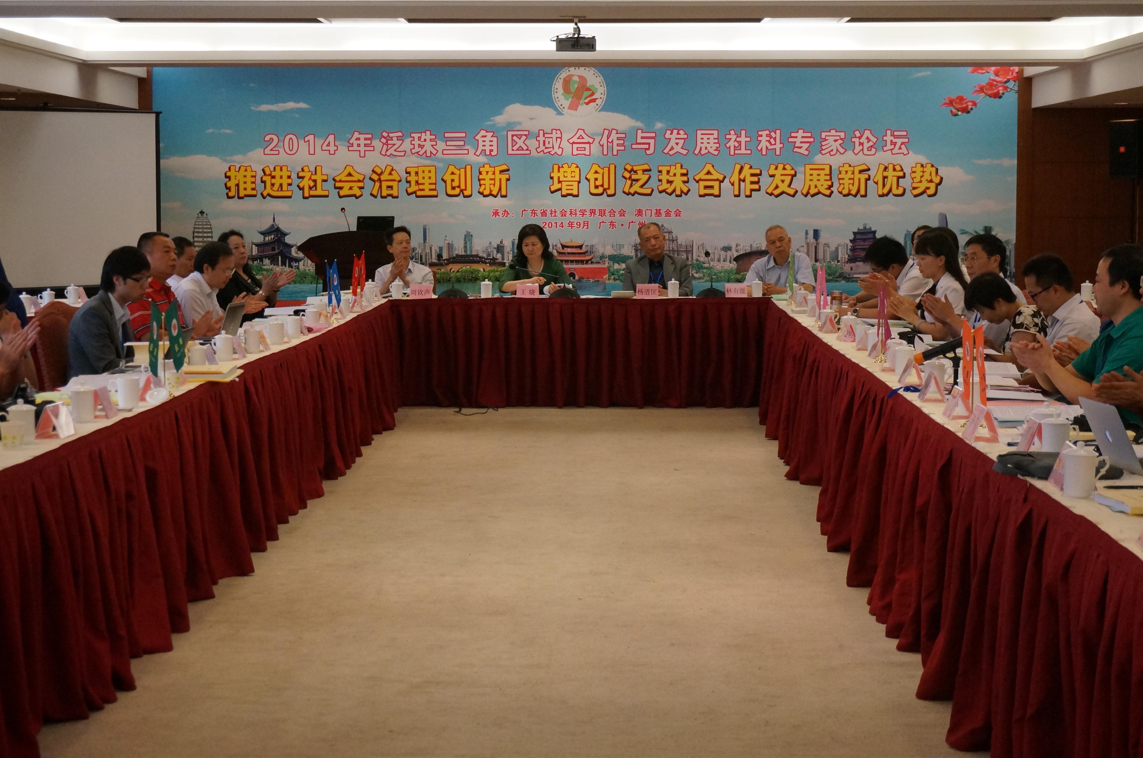 由澳門基金會以及廣東省社會科學界聯合會承辦“2014年泛珠三角區域合作與發展社科專家論壇”於9月15至16日在廣州舉行。來自泛珠三角區域包括福建、江西、湖南、廣東、廣西、海南、四川、貴州、雲南等省區社科聯、高校以及澳門特區約七十多名專家學者圍繞“推進社會治理改革創新,增創泛珠合作發展新優勢”的主題開展深入研討。澳門基金會研究所楊道匡副所長、澳門理工學院公共行政高等學校婁勝華教授、澳門理工學院學報總編輯劉澤生教授以及澳門大學澳門研究中心林廣志學術總監赴廣州出席上述專家論壇。