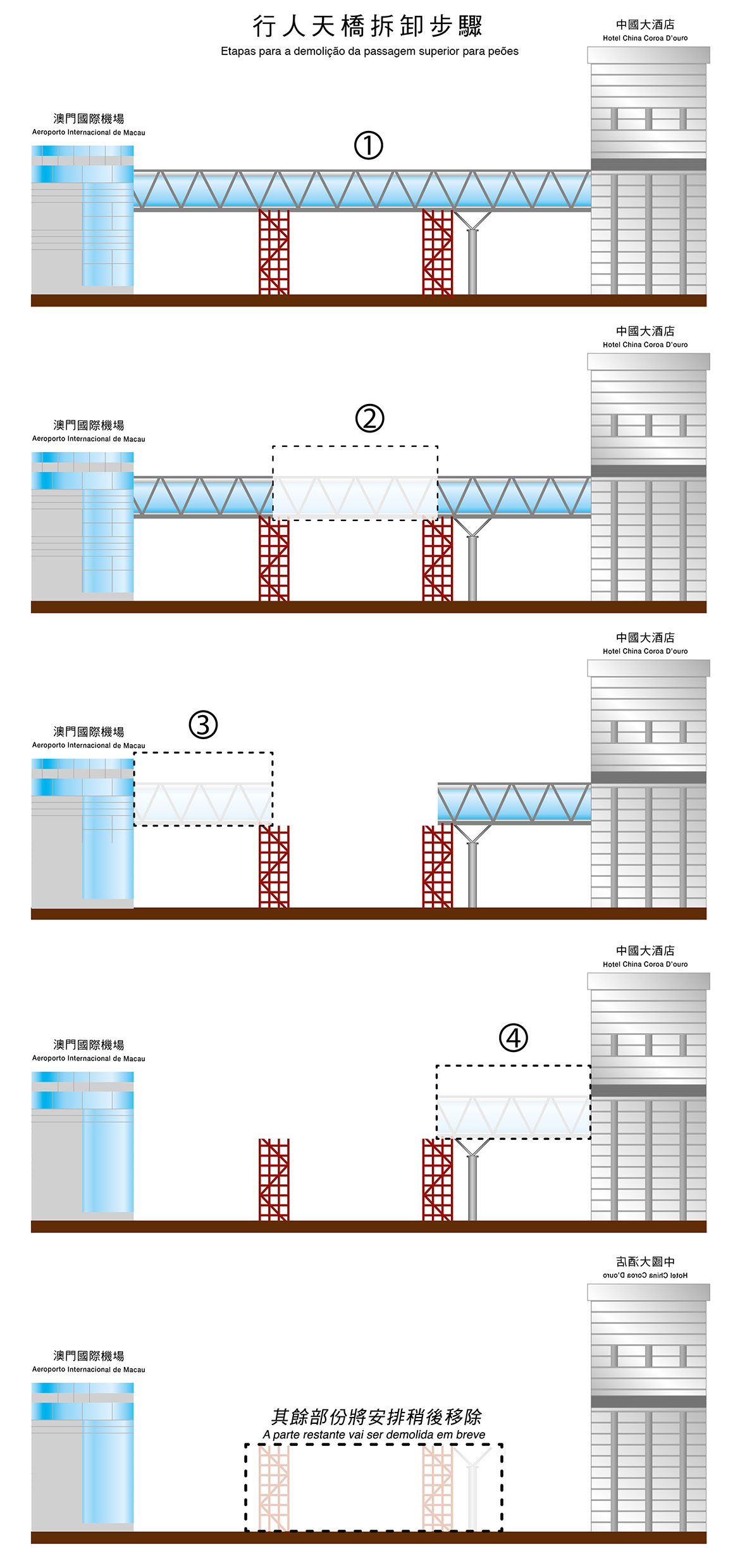 是次拆卸的行人天橋位於偉龍馬路,連接澳門國際機場與中國大酒店,天橋長約56米,重量約為30噸。整個拆卸工序涉及大型機械進場、拆件、吊運及清場等不同步驟,因應偉龍馬路日間車流量甚高,為儘量減低對公眾出行及行車安全的影響,天橋會分三晚進行結構切割,然後逐一拆卸運走。配合施工安排,機場對出行車天橋周六(20日)至周一(22日),每日晚上10時至翌日清晨6時實施臨時封閉交通,所有由北安圓形地往路氹公路圓形地方向的車輛須取道偉龍馬路下行車道行駛,現場將安排交通警員協助指揮交通。