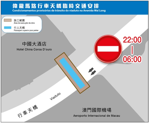 配合偉龍馬路輕軌工程,澳門國際機場對出行車天橋周六(20日)起一連三日晚上10時至翌日清晨6時實施臨時封閉交通,以拆卸連接中國大酒店的行人天橋,其間,所有車輛須取道偉龍馬路下行車道行駛。運輸基建辦公室與交通事務局呼籲駕駛者留意。