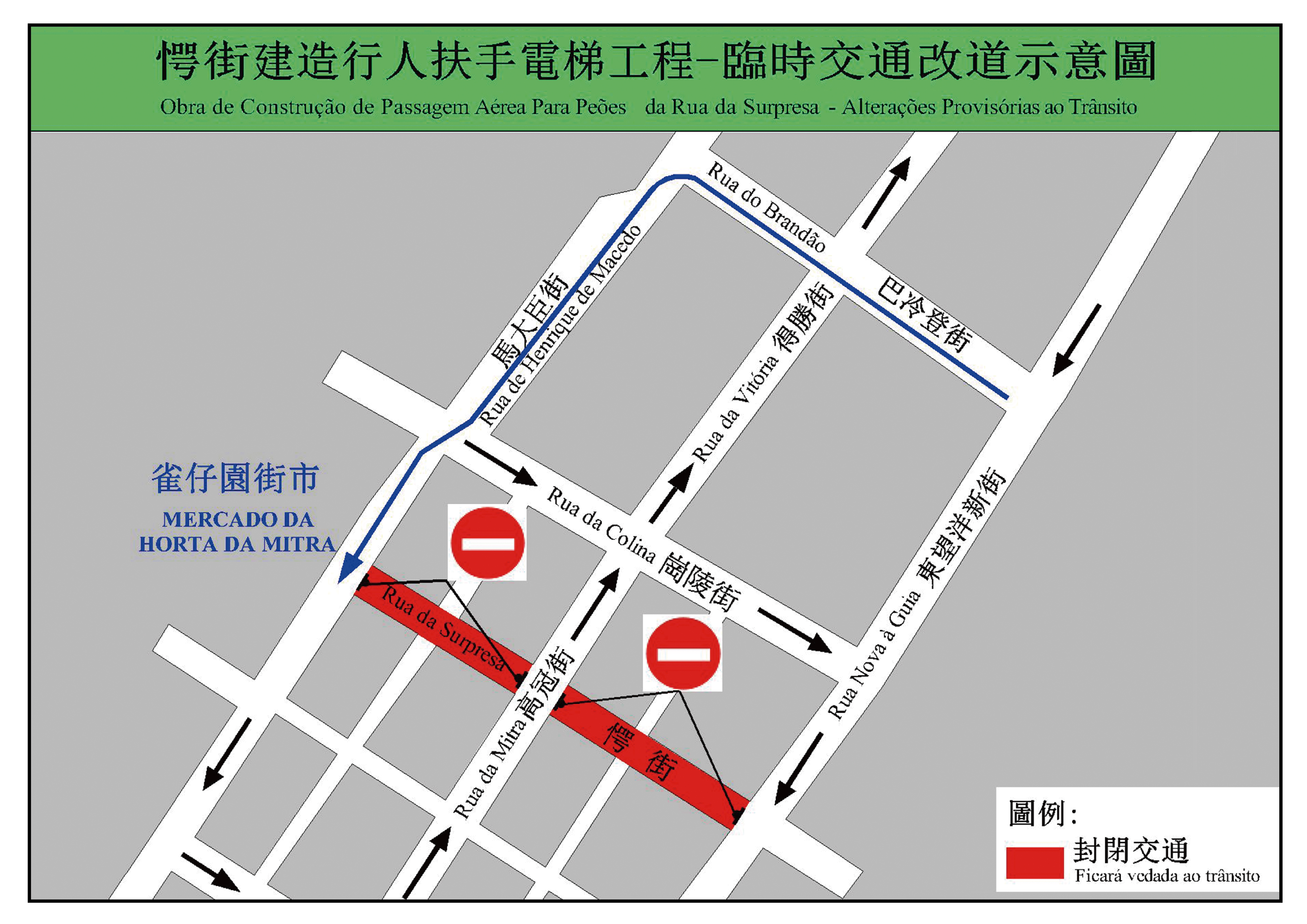 配合工程展開,愕街今天起將封閉交通及禁止泊車,而愕街與高冠街交界則實施有限度通車,車輛可經由巴冷登街前往馬大臣街。待自動扶梯建成後,愕街將禁止車輛通行,但愕街與高冠街交界的路口仍可予車輛通過,以便救護車輛進入。