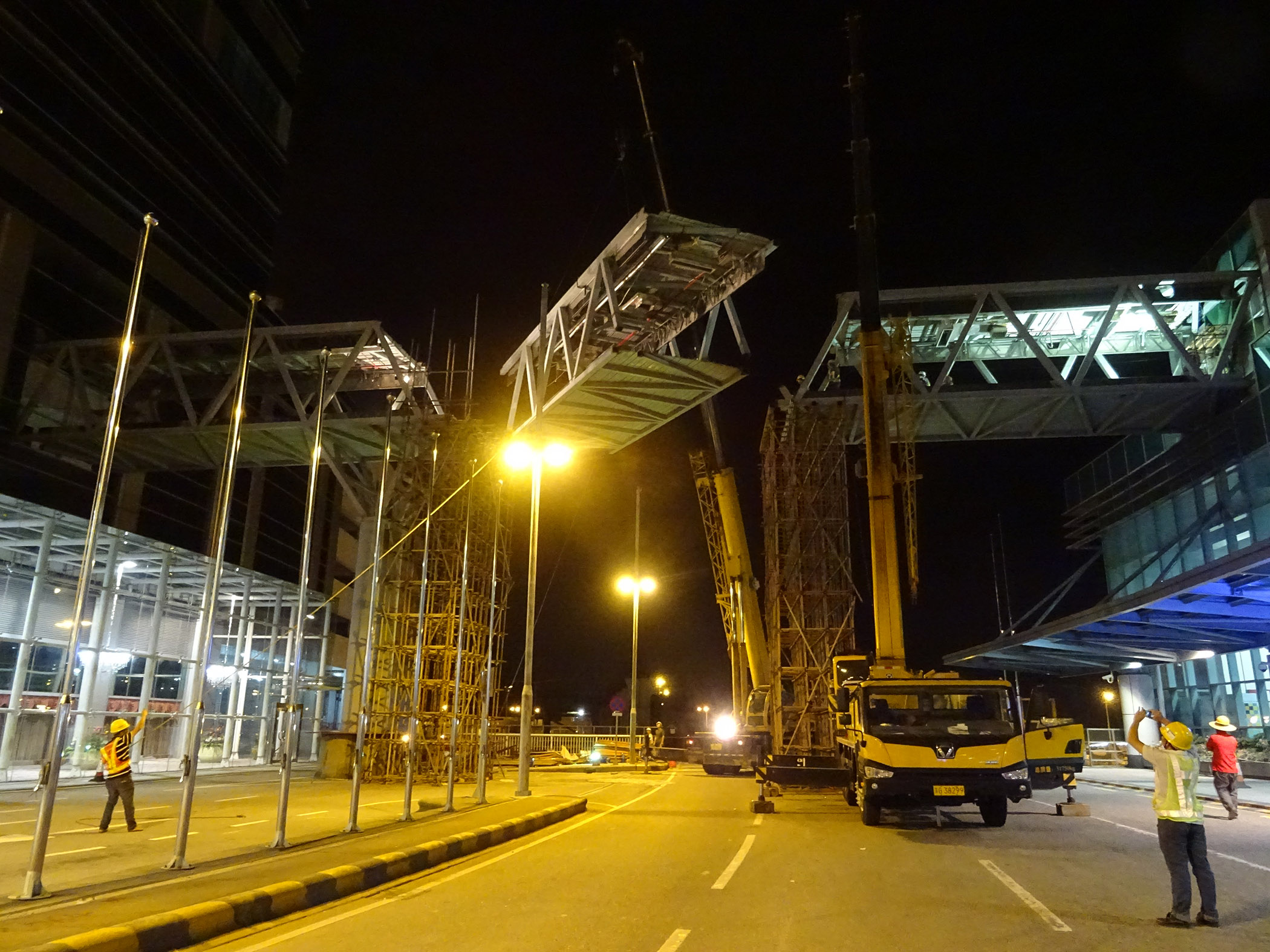 為建設澳門國際機場對出一段偉龍馬路的輕軌高架橋,施工單位需要拆卸連接澳門國際機場及金皇冠中國大酒店的行人天橋。拆卸工程原訂由上周六(20日)起一連三晚進行,期間並需要封閉偉龍馬路行車天橋的交通,以確保施工安全。經過連續兩晚的施工,且在跨部門及監理、承建單位的共同協助下,拆卸工程有序開展,並較原計劃提早於今日(22日)清晨完成,施工單位並隨即重新開放行車天橋的交通,以儘量減低對市民出行的影響。