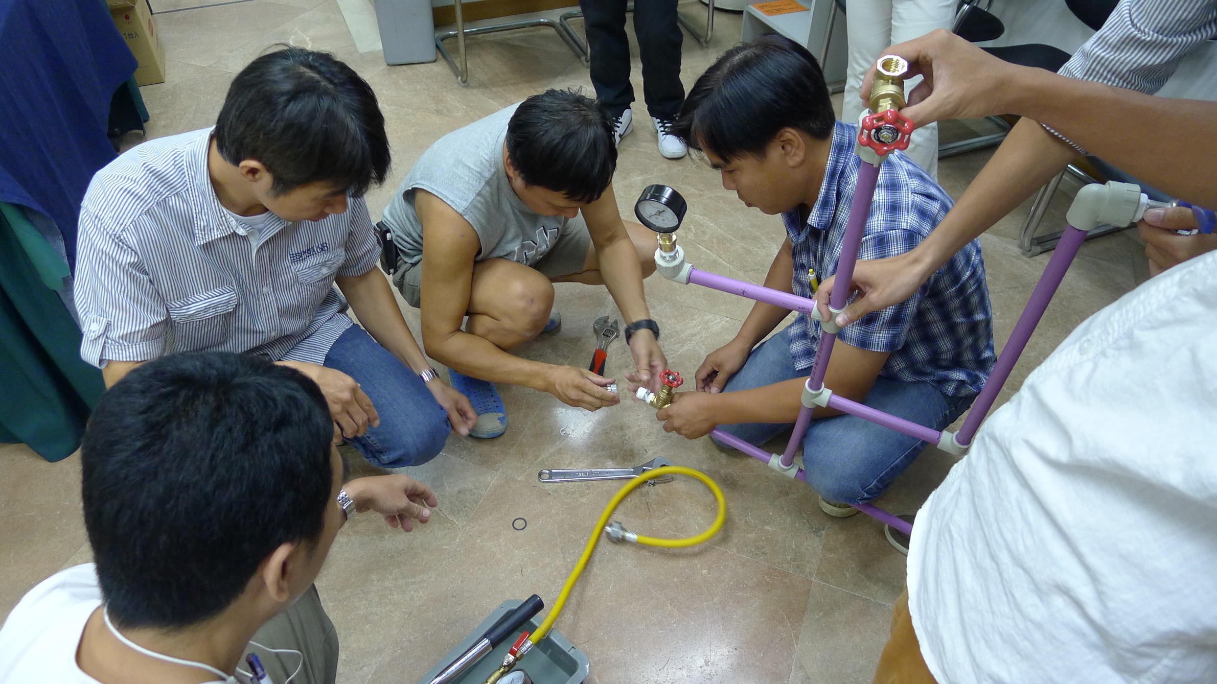 學員在工作坊上就再生水水管的接駁和安裝方面進行了實務操作。在導師的專業指導下,學員應用剪切及熱熔工具,接駁再生水水管所採用的PPR管材,切身了解PPR管材的特點、配件的用途和接駁技術,包括管材接駁的前期準備工作、熱熔機器的運用、溫度及時間的掌握等要點。學員亦被安排以分組形式進行練習,在完成管道接駁後,須對管道進行壓力測試來試驗其接駁效果。完成培訓工作坊的學員將會獲證書。