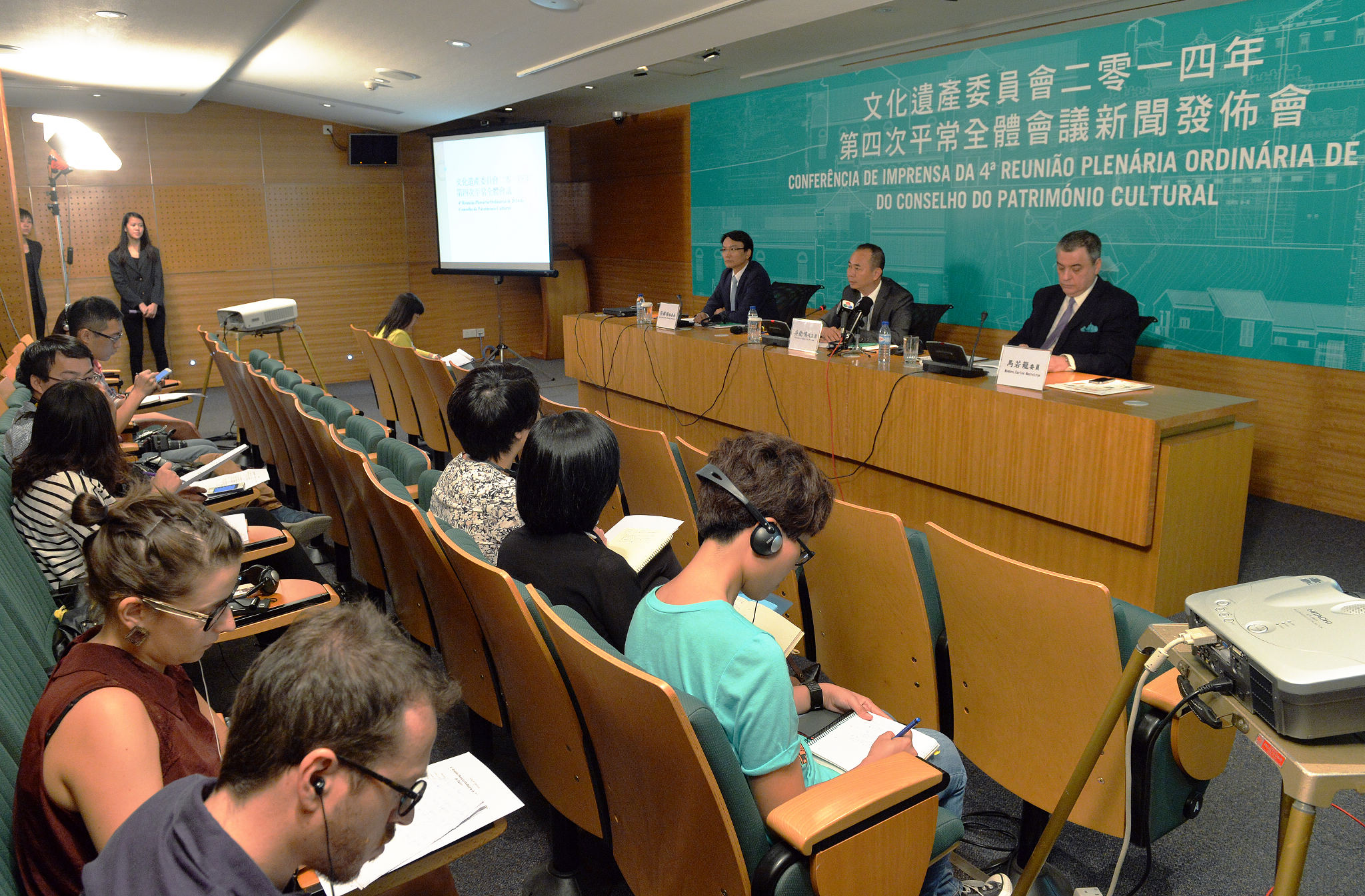 文化遺產委員會(十月十五日)下午三時在文化局大樓舉行“二零一四年第四次平常全體會議”新聞發佈會。委員會代主席吳衛鳴、秘書長張鵲橋,以及委員會對外發放訊息之代表馬若龍委員與傳媒見面,介紹委員會第四次平常全體會議情況。