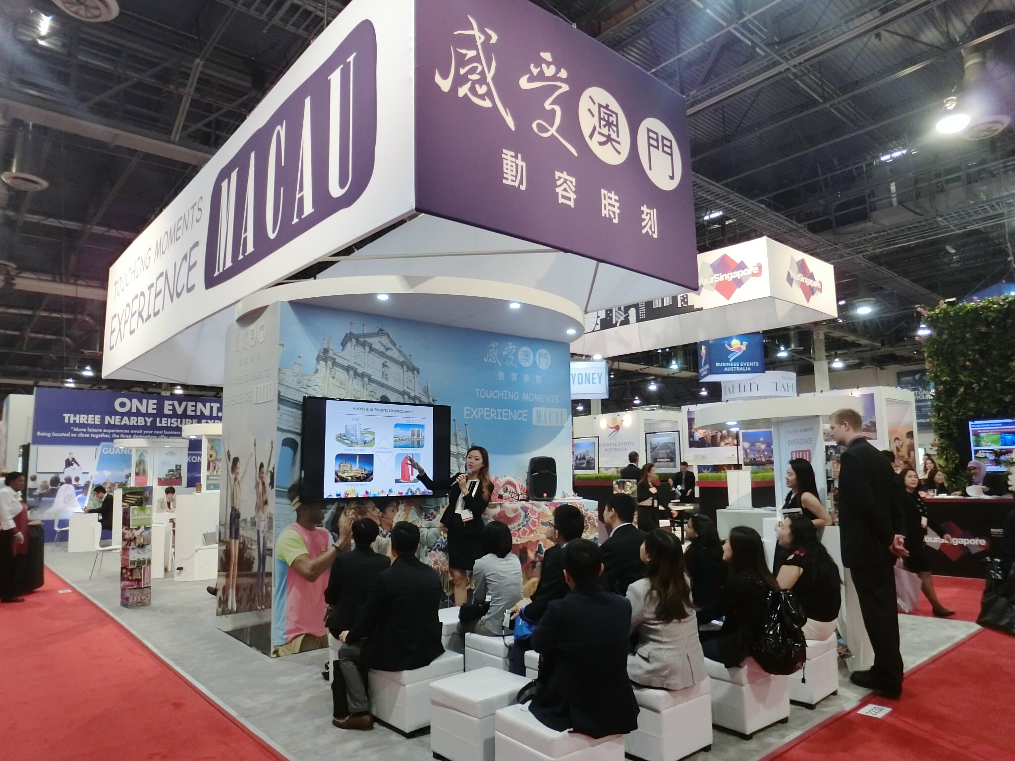 旅遊局以「感受澳門 動容時刻」為主題設置展位,在展會上聯同貿促局代表及來自澳門的旅行社及目的地管理公司等9家旅遊企業代表一起推廣澳門。旅遊局透過展位發揮的平台作用,向專業買家推介「獎勵旅遊激勵計劃」,並介紹澳門最新的商務旅遊資訊及產品,同時讓澳門業界與來自各地的買家交流資訊,洽談商機。此外,因應粵港澳三地正合作推廣區內一程多站的旅遊產品,旅遊局亦藉機宣傳一項活動帶來三地的休閒旅程體驗這個概念。