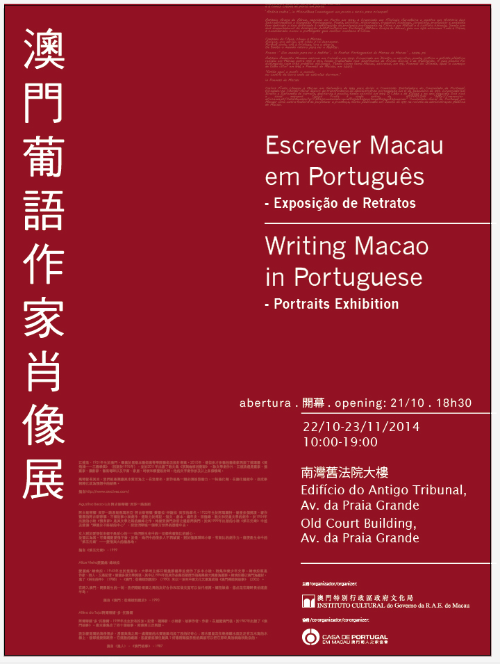 “澳門葡語作家肖像展”由十月二十二日至十一月二十三日於南灣舊法院大樓展出,時間由上午十時至下午七時,免費入場。展覽期間,《澳門葡語作家肖像展》場刊將以優惠價發售,歡迎臨參觀購買。