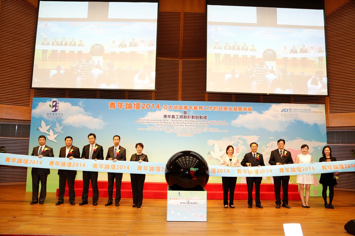 “青年論壇2014──亞太地區青年義務工作的政策及發展策略”暨“青年義工獎勵計劃”啟動禮由社會文化司司長司長辦公室張素梅主任、中央人民政府駐澳門特別行政區聯絡辦公室文化教育部李正橋部長級助理、教育暨青年局梁勵局長、澳門科學館邵漢彬館長、教育暨青年局老柏生副局長、中國台灣中華領袖菁英交流協會張仕賢會長、中國珠海市青年聯合會李娟副主席、中國宜賓市青年聯合會彭亮副主席、香港義務工作發展局羅汝衡委員、國際青年商會中國澳門總會盧善滔會長主持開幕儀式及啟動禮,逾300人出席論壇。