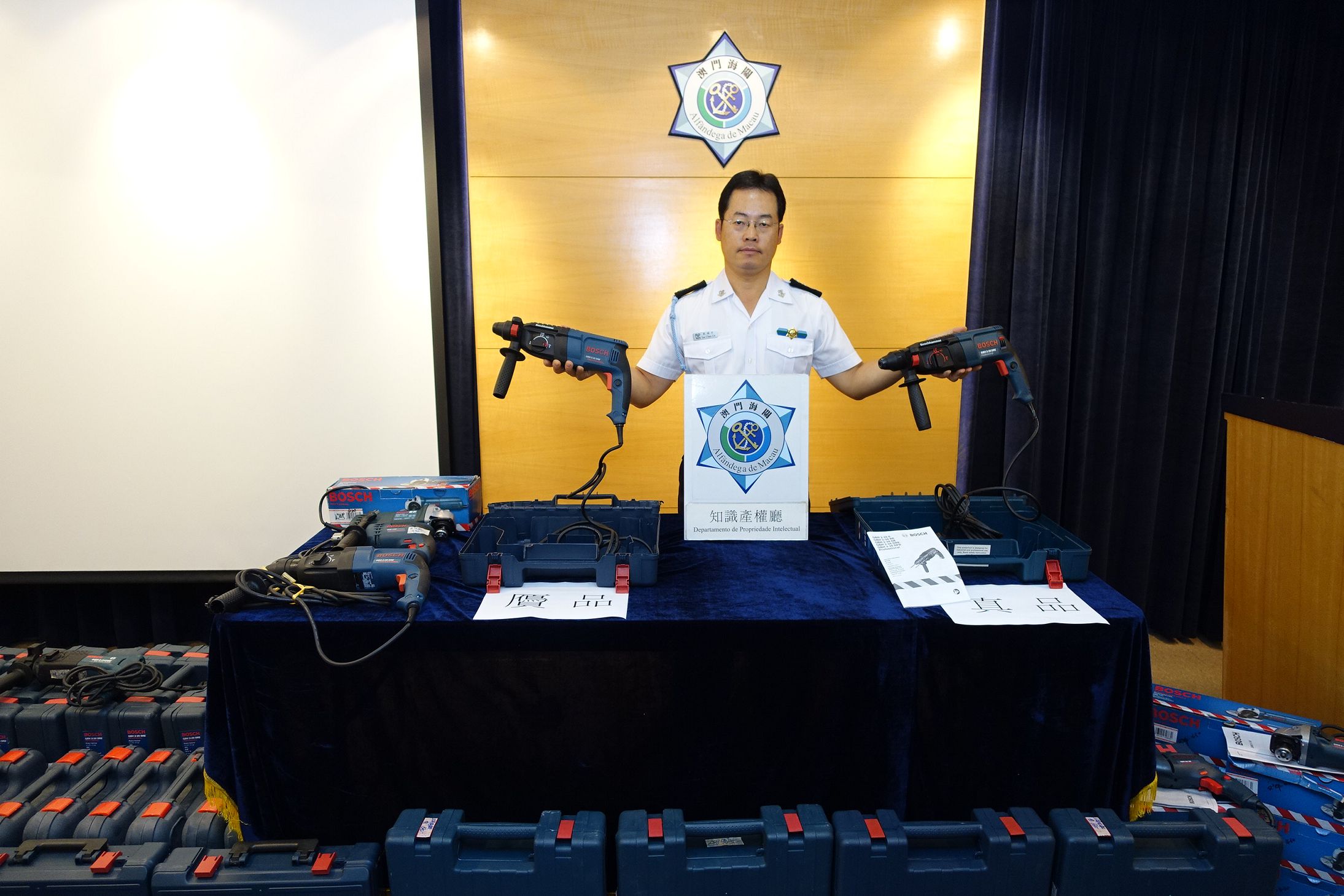 澳門海關接獲市民親臨舉報,稱其日前於北區某五金舖購買一部「BOSCH」品牌電鑽,後發覺該電鑽外觀和功能均與正品存在差異,懷疑該電鑽為冒牌貨,遂向海關作出舉報。海關接報後,立即派出知識産權廳偵查人員對相關店舖進行調查,發現店舖所出售的電鑽外表及包裝粗糙。於是採取突擊搜查行動,在三間相關店舖及一貨倉內合共帶走四男子,及一批涉嫌冒牌的電鑽回海關總部協助調查,兩名男負責人被落案起訴,將移送檢察院偵辦。