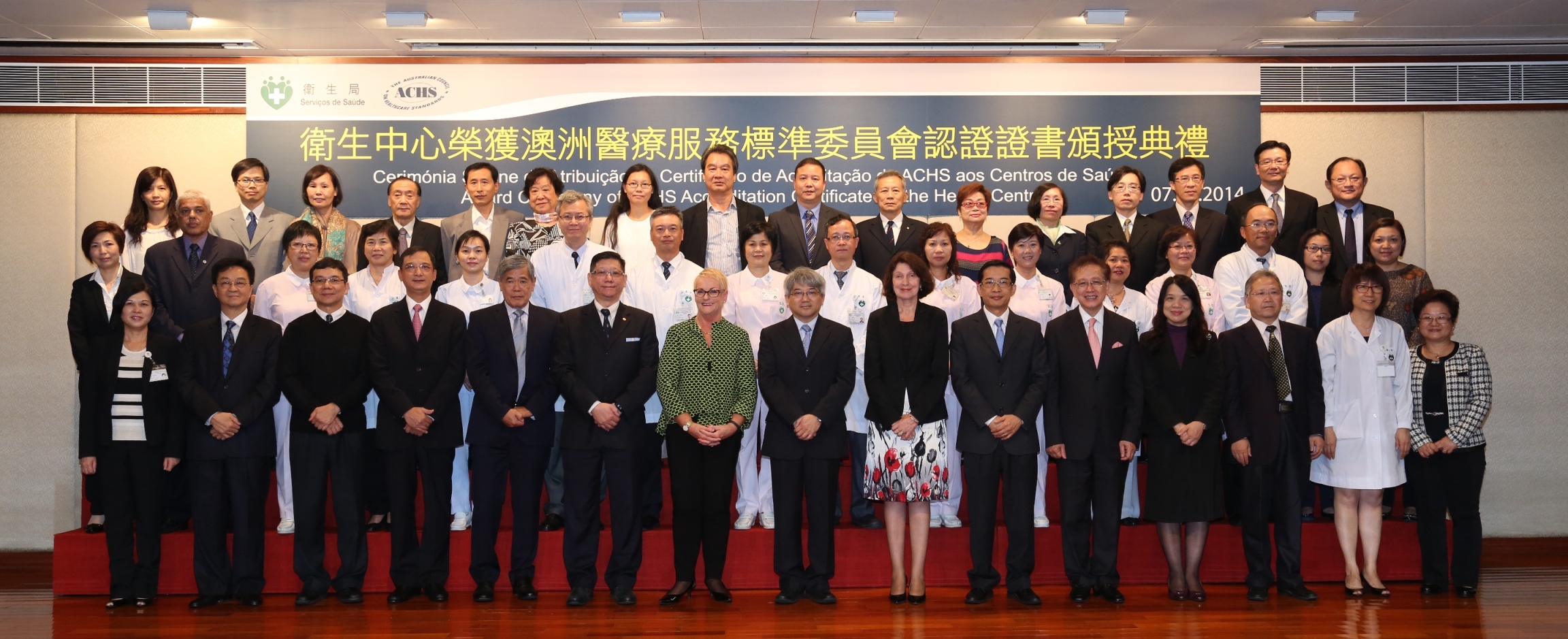 “衛生中心榮獲澳洲醫療服務標準委員會認證證書頒授典禮”今天(11月7日)於黑沙環衛生中心舉行,澳洲醫療服務標準委員會(下簡稱“ACHS”)Karen Linegar主席、Christine Dennis執行總裁、Desmond Yen執行總監專程來澳向6間衛生中心代表頒授證書。出席典禮的嘉賓有衛生局李展潤局長、陳惟蒨副局長、鄭成業副局長、何鈺珊副局長、立法會議員及醫委會副主席陳亦立、鏡湖醫院馬學章院長、科大醫院王玉來院長、醫務委員會顧問吳在權及仁伯爵綜合醫院名譽顧問賴福明醫生等,還有醫務委員會委員、工人醫療所及母乳協會代表出席。