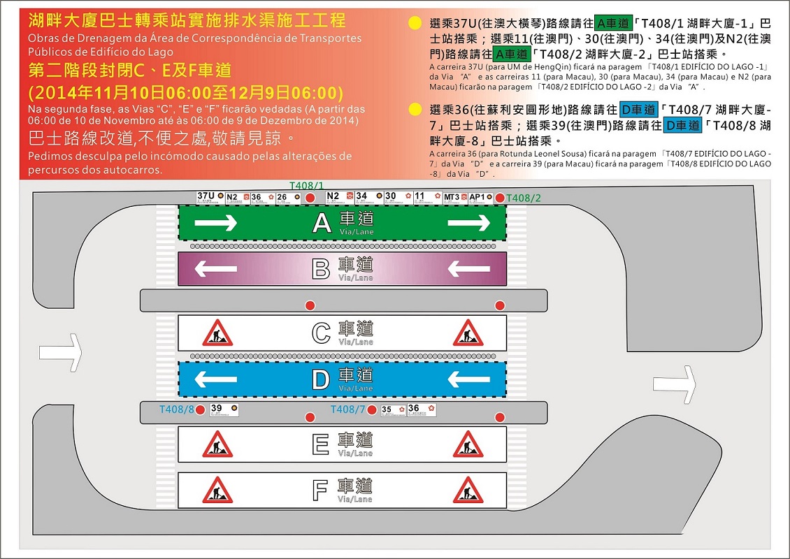 湖畔嘉模衛生中心建造工程採取分階段施工形式進行,以盡量減低居民使用湖畔大廈巴士轉乘站出行的影響。首階段工作已接近完成,接續第二階段工程將於本月10日(周一)上午6時起開展,並臨時封閉C、E及F車道,往澳門方向的11、30、34及N2,往澳門大學方向的37U路線改停靠A車道;39路線(往亞馬喇方向)改停靠D車道;36路線(往蘇利安圓形地)則使用D車道近出口方向之巴士站上落。