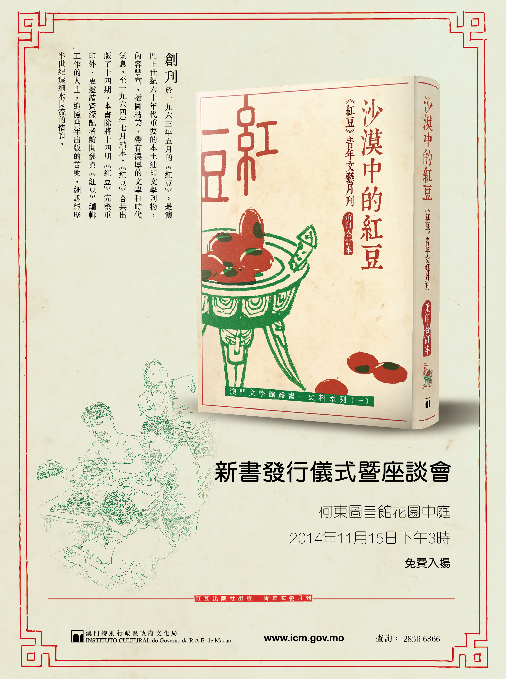 《紅豆》青年文藝月刊創刋於一九六三年五月,是澳門上世紀六十年代重要的本土油印文學刋物,內容豐富,插圖精美,帶有濃厚的文學和時代氣息。許多澳門文學研究者都曾知聞《紅豆》一書,卻無緣親睹其刊,尤其是整套十四期的全貌。鑒於其公認的文學及史料價值,文化局決定原版重印《紅豆》,讓文學愛好者和研究者能夠原汁原味地領略該刊風貌。為使重印版形象更立體,以及具有歷史感和時代感,文化局委託專人訪問參與《紅豆》編輯工作的人士,寫成《追憶紅豆》一文附於該書,極富史料價值。發行儀式暨座談會上,多位曾參與當年《紅豆》編輯工作的文學前輩李艷芳、陳渭泉、尉少奇、韋漢强、楊道炘和司徒鏗等,將與讀者追憶出版的苦與樂,細訴經歷半世紀還細水長流的情誼。座談會由《新生代》雜誌採訪主任呂珠玲主持,該書為“澳門文學館叢書‧史料系列”的第一本出品,該套叢書的規劃與出版,旨在透過整理文學史料和作品,為學者的研究提供原始文本材料,進而期待書寫出更具廣度與深度的澳門文學史著作。