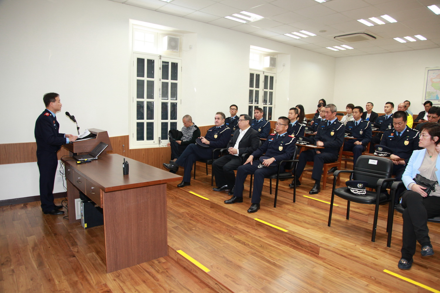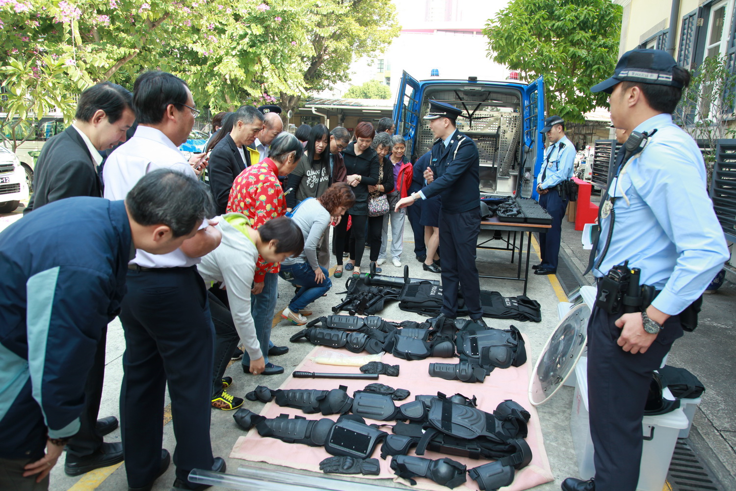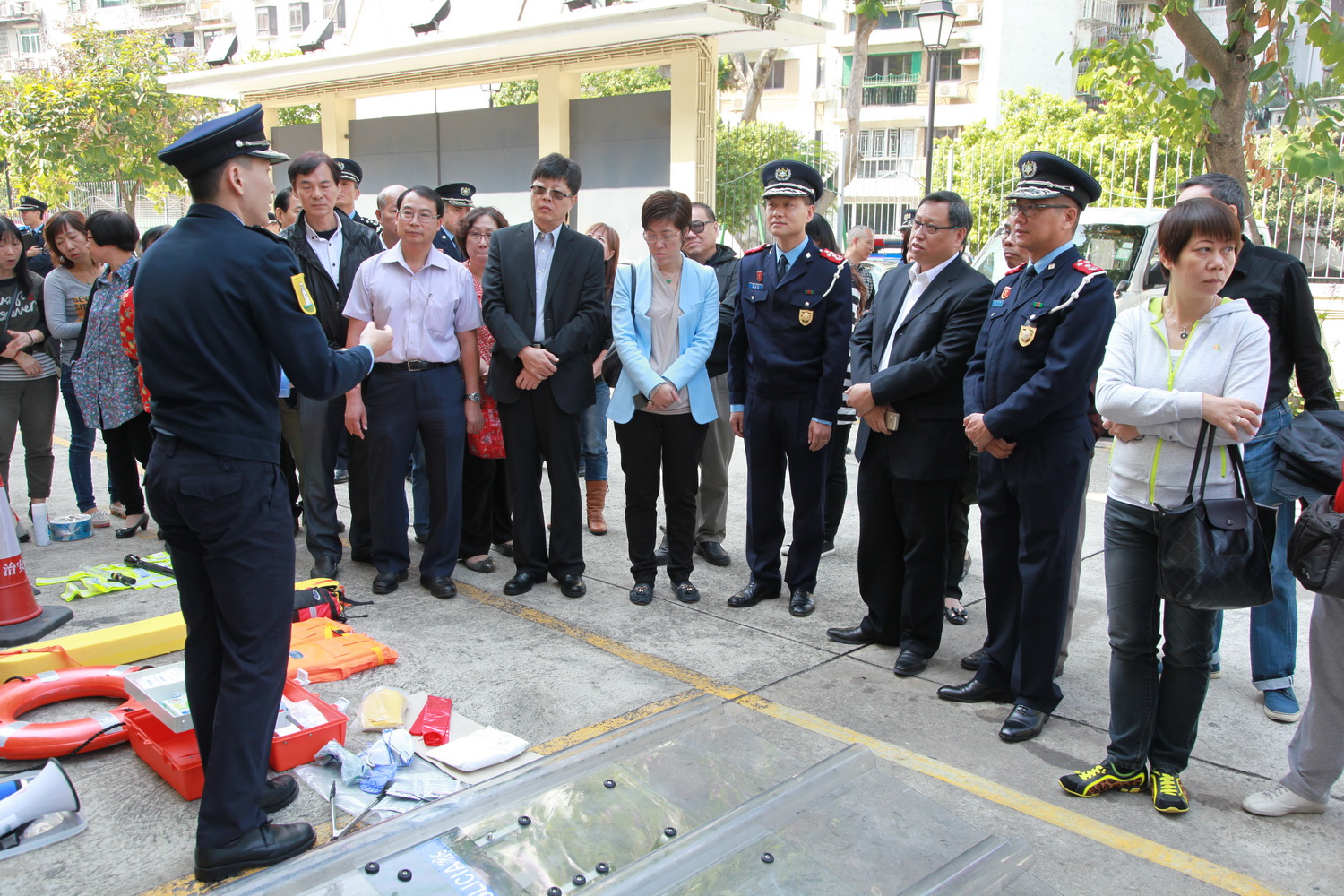 活動接著由警務廳及交通廳的代表就本年的整體治安形勢進行工作簡報,透過統計數字介紹治安以及交通狀況,提醒社區主任第四季度應防範的事項,亦播放了內部士氣宣傳片予嘉賓欣賞;其後社區主任參觀了交通廳的裝備器材,以及今年最新推出的特別巡邏組車輛及精良裝備。交通管理工作與市民生活息息相關,而今年新成立的特別巡邏組更是市民安全所賴,當中展示的各種新式防護裝備和武器吸引了嘉賓的視線,社區主任們展現出極大的興趣,讚嘆之餘紛紛發問,拍照留念或親身試用警備,互動氣氛熱烈。