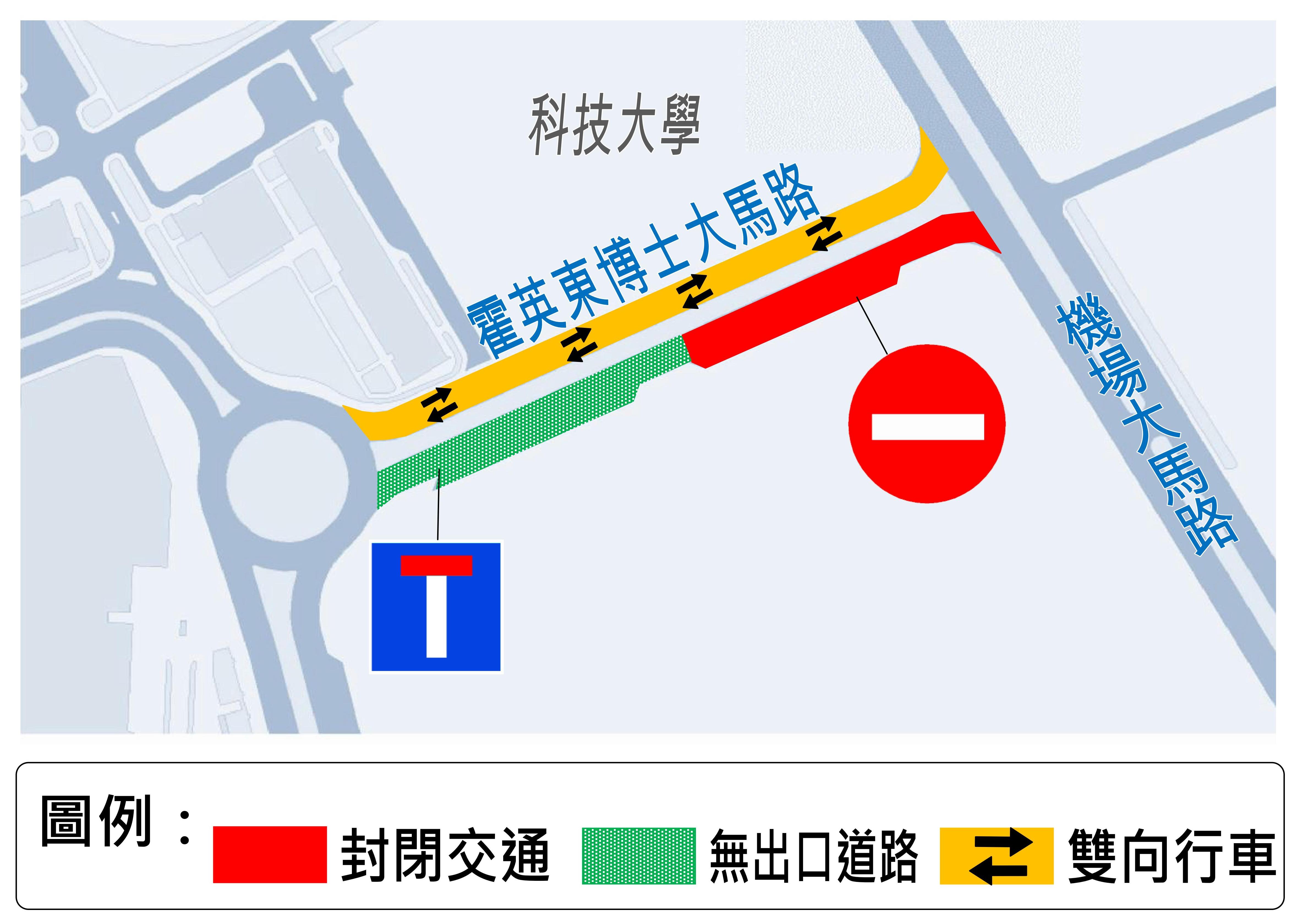 施工期間,介乎氹仔科技大學圓形地與機場大馬路之一段霍英東博士大馬路,往科技大學圓形地方向之車道會改為無出口道路,而往機場大馬路方向之車道會臨時改作雙向交通,以維持上述路段行車路徑不變,以減低對市民出行的影響;與此同時,位於霍英東博士大馬路之“霍英東博士大馬路/機場大馬路”巴士站將遷至機場大馬路,距離原站約140米之位置,方便乘坐35、50(往亞馬喇前地方向)及MT4路線之乘客上落。