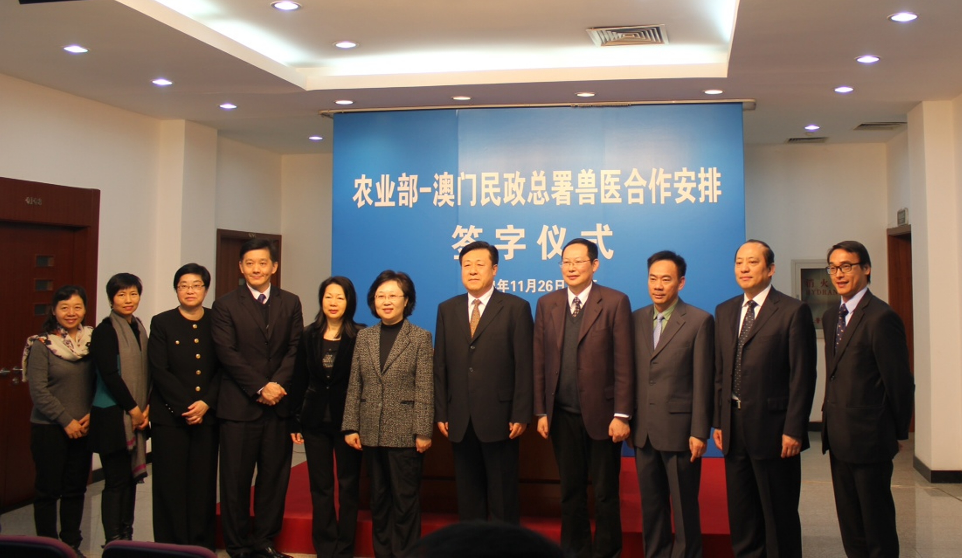 在陳麗敏及國家農業部副部長于康震見證下,民政總署管理委員會主席黃有力與國家農業部獸醫局局長張仲秋共同簽署了《中華人民共和國農業部與澳門特別行政區民政總署關於獸醫合作的安排》,內容包括重點加強雙方在獸醫立法、執業獸醫管理、動物疫情和初級動物源性食品安全重大事件通報、國際獸醫事務、人員培訓等方面的交流合作,在世界動物衛生組織(OIE)相關活動中的合作、建立獸醫管理機構直接對話機制、將禽流感等重大動物疫病和狂犬病等重點人畜共患病列為雙方聯防聯控重點動物疫病、就內地獸醫在澳門執業及推進澳門居民在內地參加執業獸醫資格考試和執業事宜建立直接溝通及協商機制。