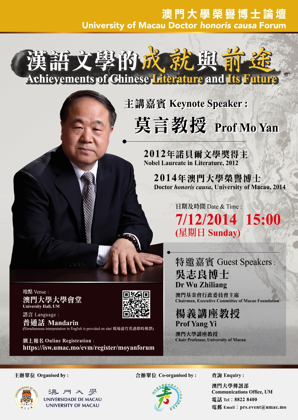 第一位獲得諾貝爾文學獎的中國籍作家莫言將於十二月七日(星期日)下午三時在澳大大學會堂以“漢語文學的成就與前途”舉行論壇,對當代漢語文學的世界性影響、漢語文學的地域多元性和文化多元性、漢語文學面臨的困難和應有的前途等問題進行精彩闡述;同時,澳門基金會行政委員會主席吳志良博士與澳大講座教授楊義作論壇的特邀嘉賓,這將是一次高水平的學術對話,精彩可期。莫教授是中國現當代首屈一指的作家,“用幻覺現實主義將民間故事、歷史和當代融為一體”,成為首位中國籍諾貝爾文學奬得主。他八十年代以一系列鄉土作品崛起,一九八六年發表的《紅高粱》在文壇引起轟動,成為中國當代文學中新歷史小說的開山之作,被譯成近二十種文字在全世界發行。