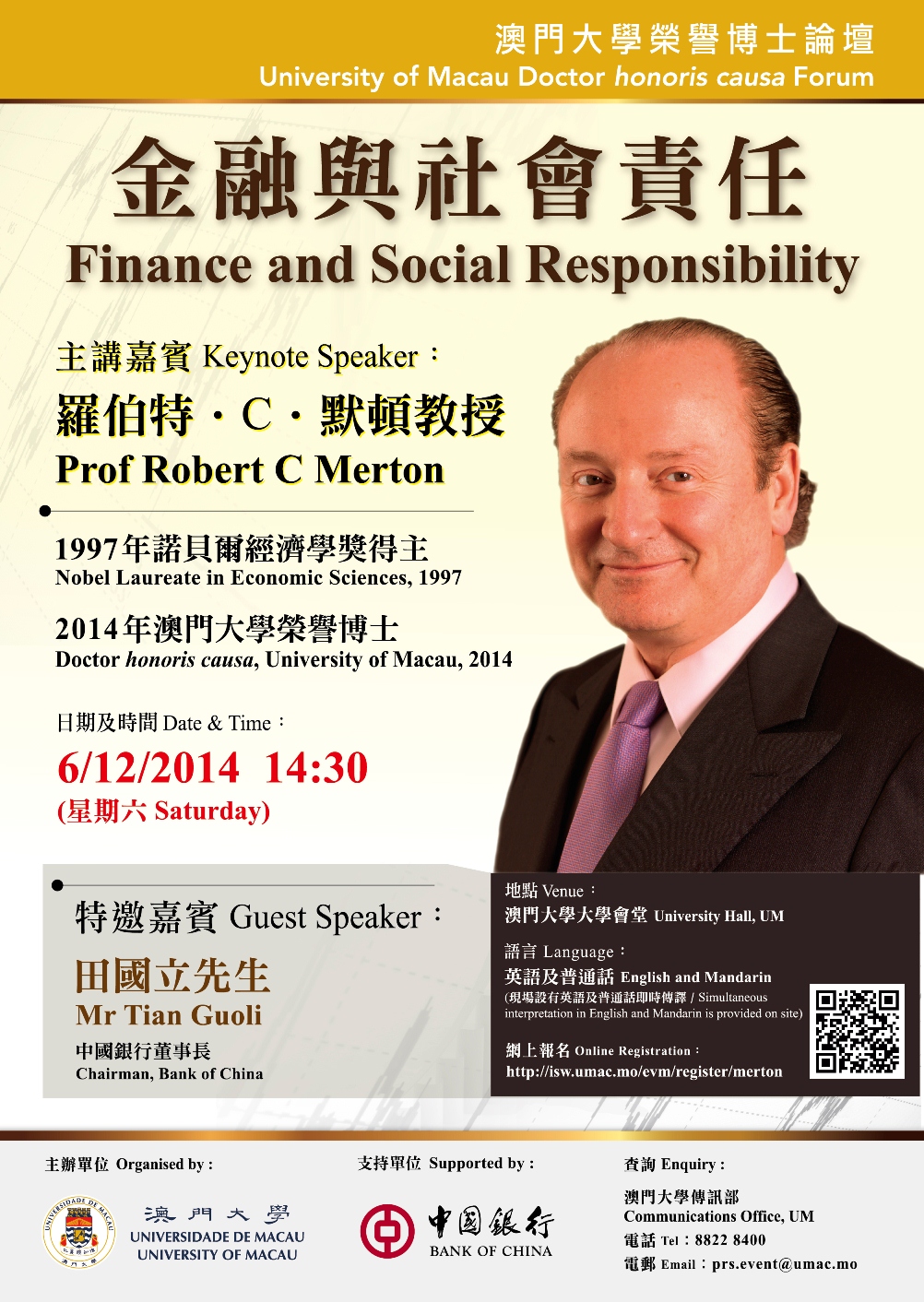 首場澳大榮譽博士論壇“金融與社會責任”將在十二月六日(星期六)下午兩時三十分在澳大大學會堂舉行。美國經濟學家羅伯特‧默頓教授以“將金融理論應用於實踐”而聞名,他的“期權定價理論”(Option Pricing Theory)、“跨期資本資產定價模型”(Intertemporal Capital Asset Pricing Model)對金融學和經濟學產生了深遠影響,其“複製組合”(replicating portfolio)方法仍然是當今推行衍生證券的標準,一九九七年他憑對金融衍生產品定價方法的創新獲得諾貝爾經濟學獎。講座上,他將以金融學在全球金融實務中扮演的角色:過去、現在與將來展開論壇,分享他對金融學實踐化的見解,引證金融學對全球金融實務的重要性。論壇特邀中國銀行董事長田國立擔任嘉賓,演講“勇於擔當,推動社會可持續發展”。