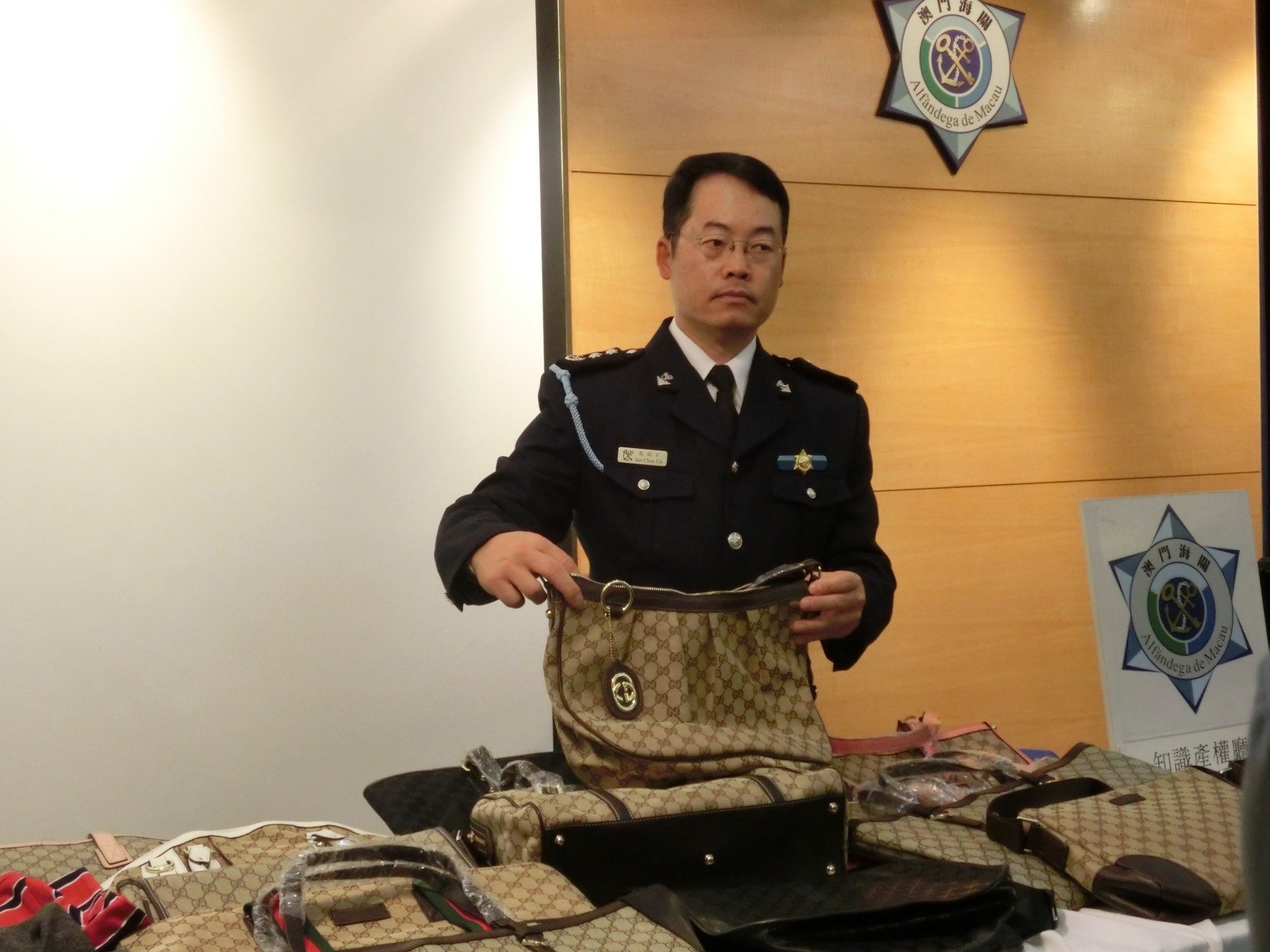 於十二月三日,澳門海關口岸監察廳國際機場海關站稽查人員,在機場貨運站檢查一批由外地經路氹新城海關站進入本澳,再轉準備運往其他地區的轉口貨物時,海關站人員發現除了轉運申報單上所報稱的一百五十三箱貨物之外,還有一批沒有申報的貨物。經詳細檢查後,發現該批没有申報的貨物為國際知名品牌物品,當中包括:手袋、銀包、手錶、皮帶、手帕、長靴、長褸、手持式麥克風等,明顯與申報單內容不符。海關口岸監察廳遂聯同知識產權廳作進一步聯合偵查,發現該批貨物涉及多個知名品牌,其中五個品牌已在澳門經濟局註冊,經品牌鑑定人進行核查後,初步證實為假冒名牌物品。