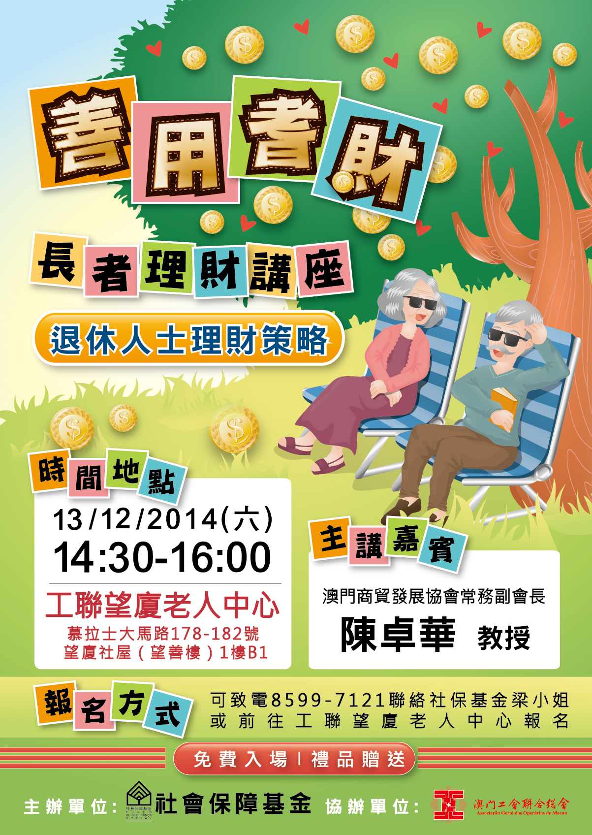 該場次講座由社保基金主辦,工會聯合總會協辦。有興趣的人士可於辦公時間致電85997121,或到工聯望廈老人中心報名。活動名額有限,額滿即止,詳情可瀏覽社保基金網頁www.fss.gov.mo。