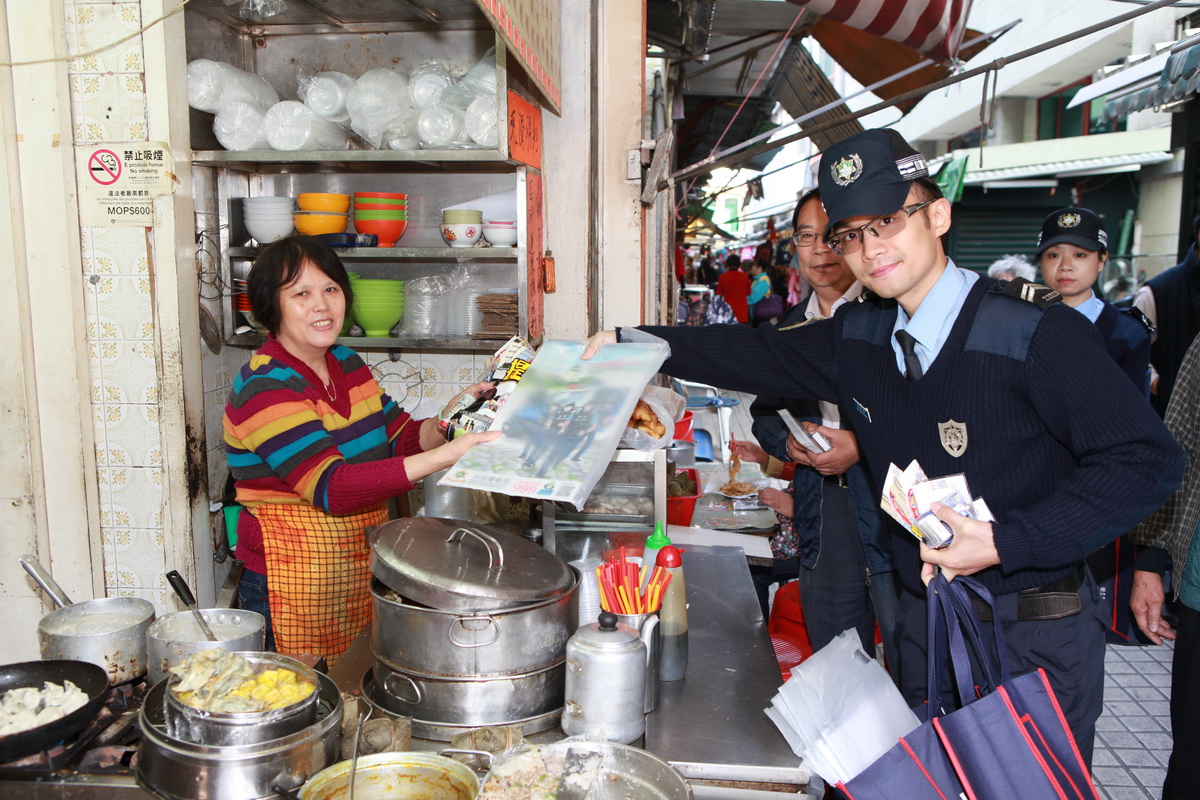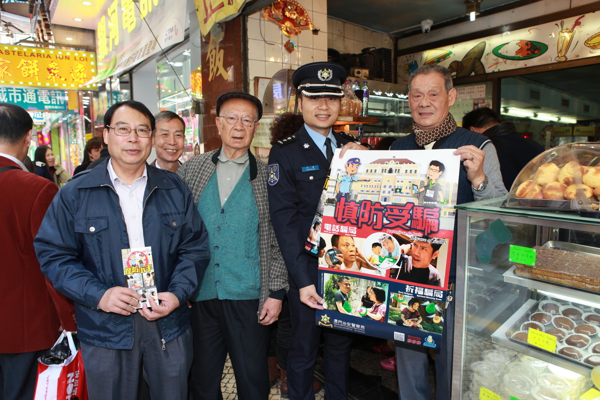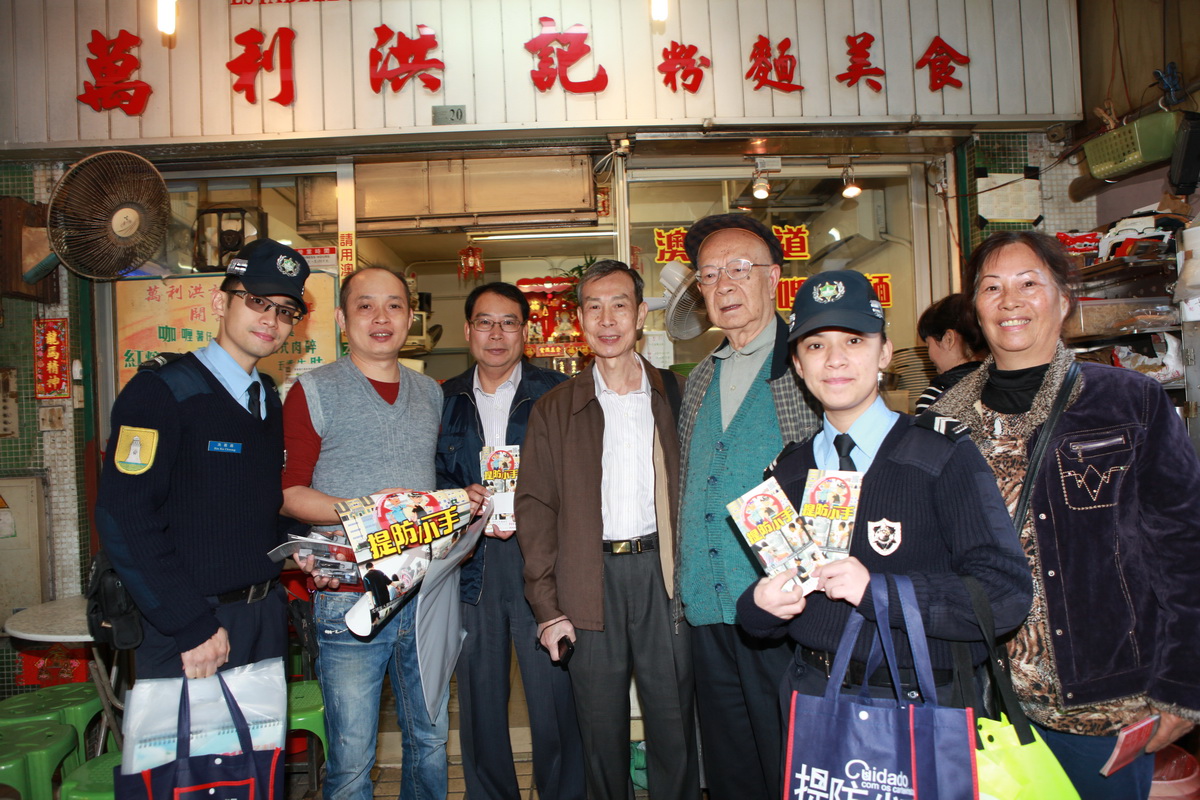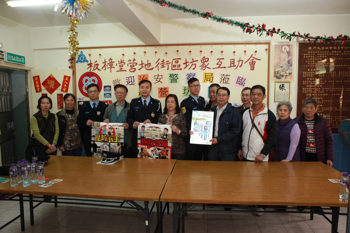 今日上午,治安警察局公關處林強副警司聯同第一警務警司處陳國䘵副警司一行八人,與板營坊會鄒金玉理事長及劉國燊副理事長及坊會代表進行座談並通報最新警情,會上主要就區內常見犯罪類型進行交流討論,並提醒區內居民長假期若舉家外遊,臨行前應注意做好措施,鎖好門窗,勿將大量貴重物品放在家中,與鄰居及管理人員多加溝通關顧;管理公司及人員亦須把好第一關,加強巡樓,嚴防盜賊;提醒身邊長者切勿輕信陌生的說話,便宜莫貪,慎防祈福黨,寶藥黨等重施故技。會後,本局人員與坊會代表一起在區內進行宣傳,警民合力向各商戶、居民及旅客進行街頭防扒、店鋪防盜、長者防騙的宣傳活動,宣揚 “警民一家,防盜”的信息。