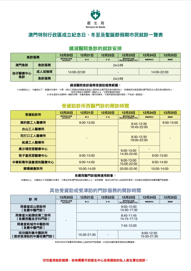 澳門特別行政區成立紀念日(12月20日)、冬至(12月22日)、聖誕節前日(12月24日)及聖誕節(12月25日)為公眾假日,而澳門特別行政區成立後首個工作日(12月23日)為公共行政工作人員獲准豁免上班日,上述期間衛生局將維持相關的部分醫療服務,為此作出如下的安排: