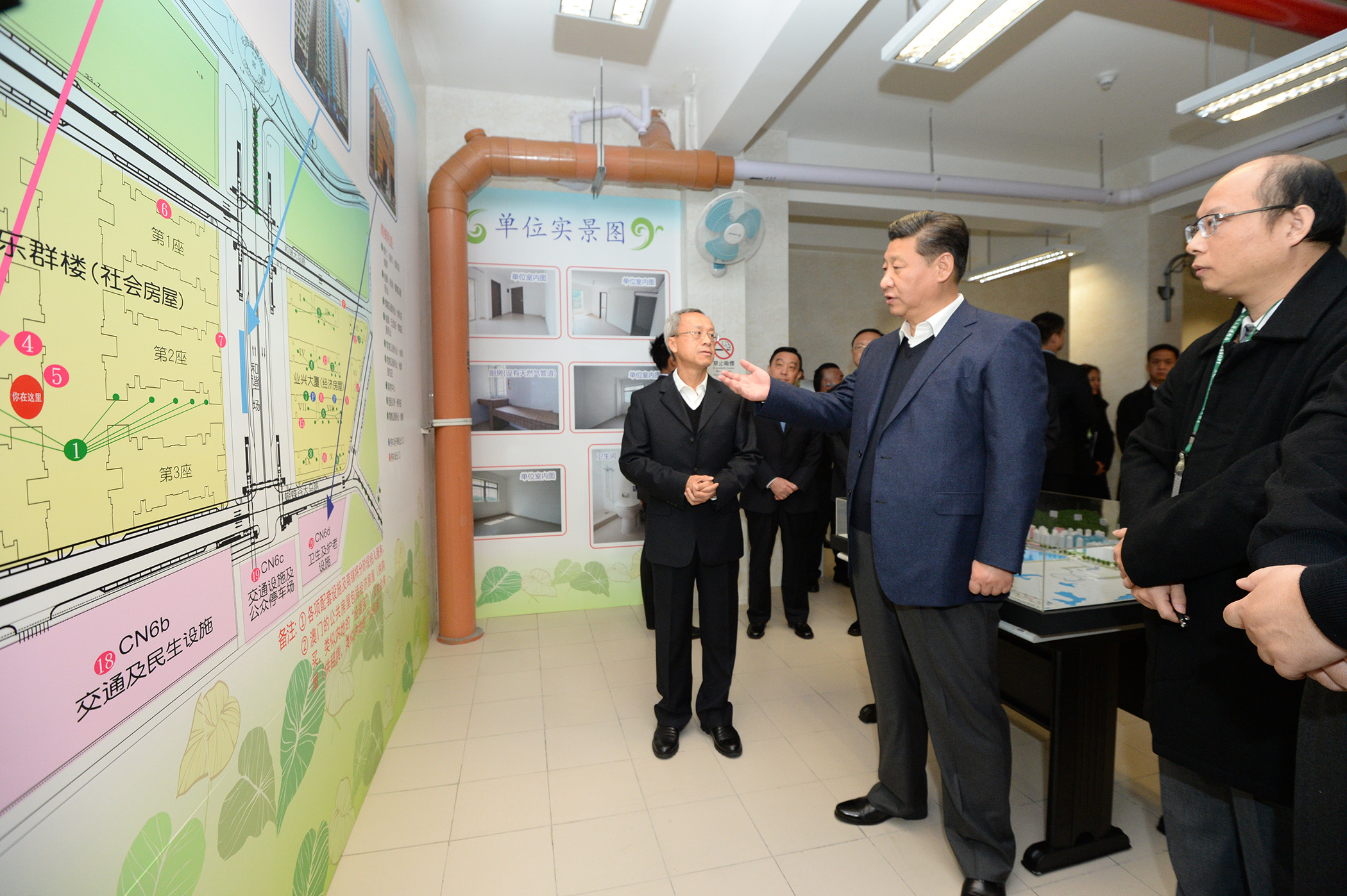 習近平主席下午在行政長官崔世安陪同下抵達路環石排灣公屋群,由運輸工務司司長劉仕堯迎接,同行者尚包括代表團成員栗戰書、王光亞、李剛等。習主席首先於樂群樓第五座觀看沙盤,並聽取土地工務運輸局城市規劃廳廳長劉榕講解澳門公屋群整體規劃及建設狀況,主席更提出宜增加綠化帶及環保設施。