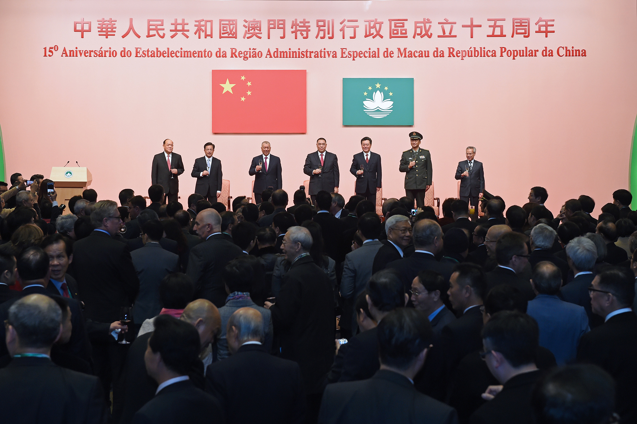 澳門特別行政區政府今(20)日下午舉行特區成立十五周年招待酒會,行政長官崔世安表示,特區能應對多方面考驗,保持穩定發展大局,並拓展出新發展空間,正正充分展現出“一國兩制"的制度優勢和強大的生命力。新一屆政府務必貫徹“以人為本,科學施政”的理念;務必把國家與特區的發展緊密聯繫,發揮好“一國兩制”的制度優勢。