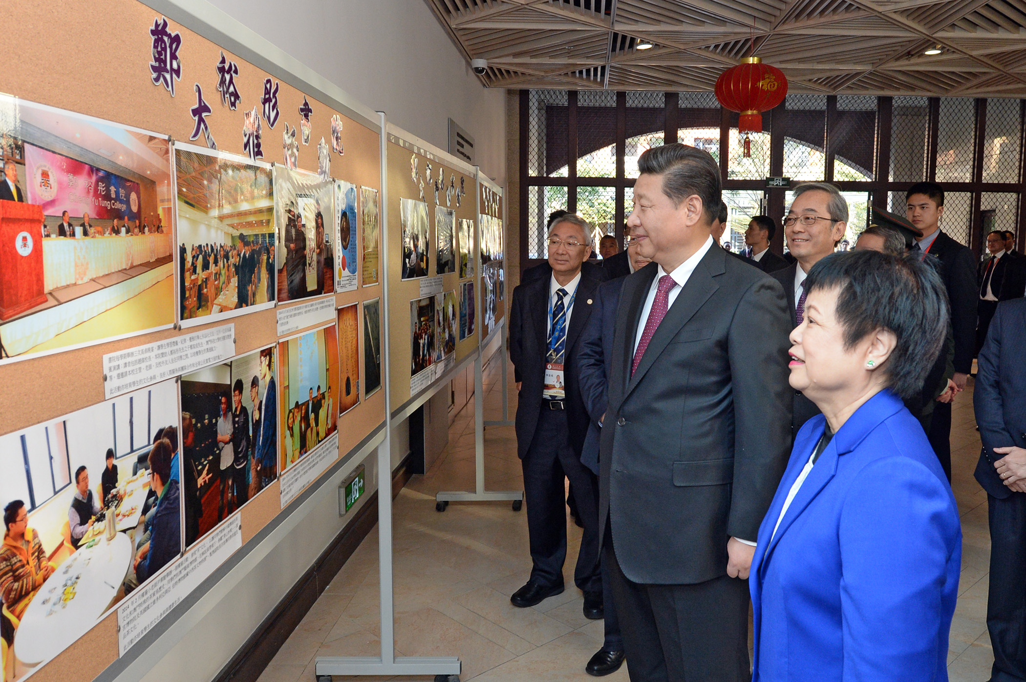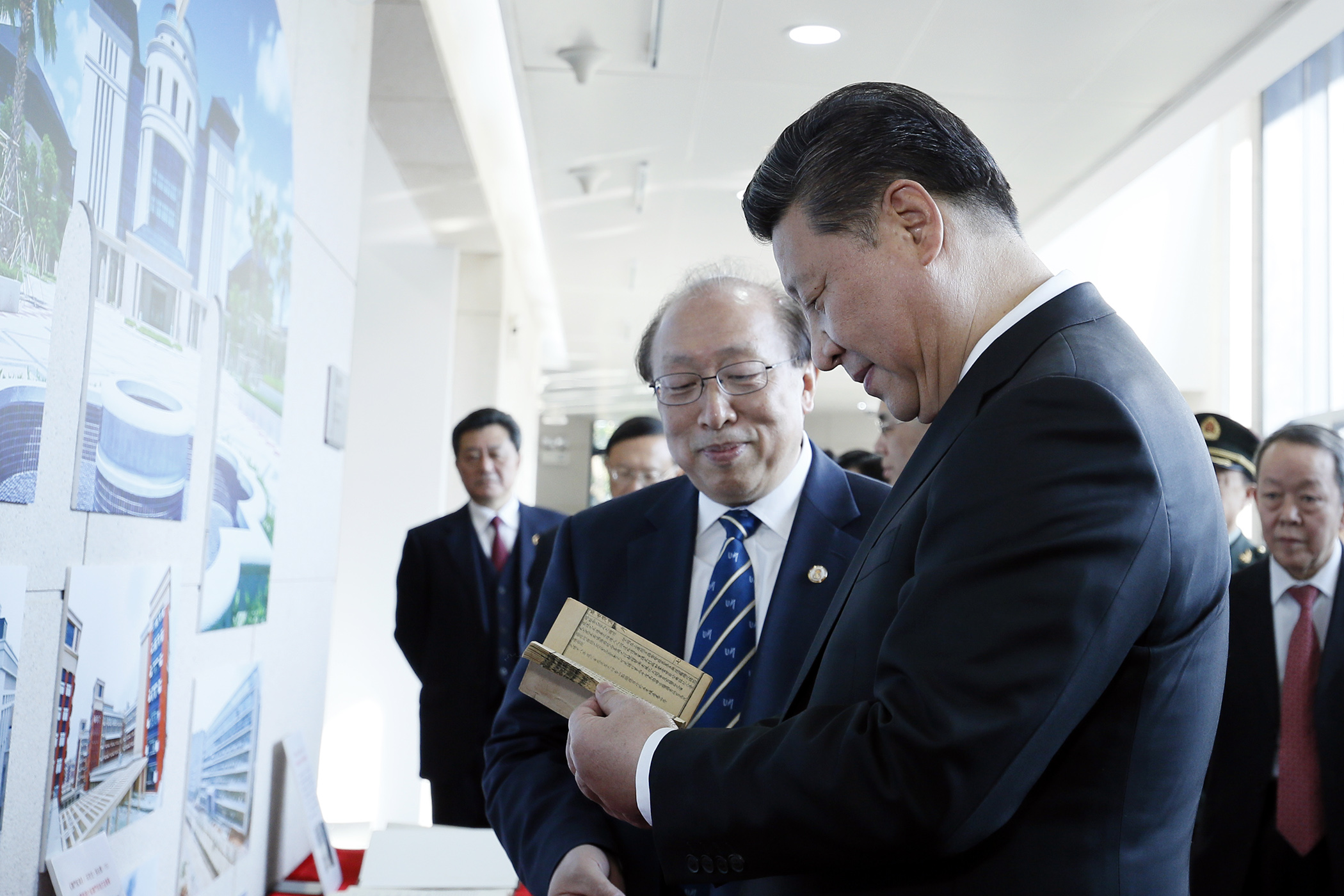 習主席又參觀澳大八所書院的其中一所書院:鄭裕彤書院。副校長(學生事務)程海東和該書院院長鍾玲分別介紹了書院系統和書院設施。澳大借鑒世界一流學府的經驗,建立亞洲最大規模和最完整的書院系統,書院學生來自全校不同專業,一起生活、共膳及學習。習主席參觀書院期間,適值有學生正在討論中華傳統文化與當代青年。習主席參與其中,與學生互動交流,談及中國文化對澳門的影響,並勉勵學生努力學習,青出於藍,學以致用。最後習主席更向澳大贈送了兩套書籍,分別是《北京大學圖書館藏稀見方志叢刊》和《永樂大典》重印本,並在贈書函上簽名。
