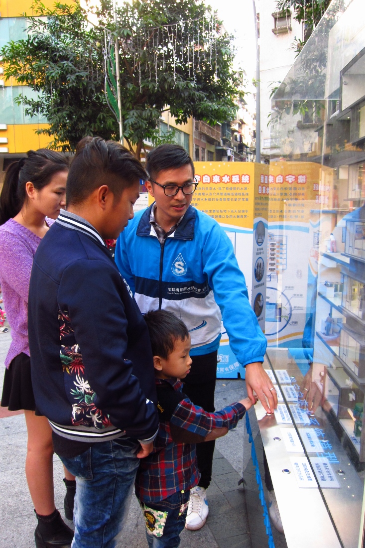 為向市民加強推廣節水和維護樓宇自來水系統,特區政府推動構建節水型社會工作小組(下稱小組)今日假三盞燈圓形地舉辦“社區節水巡禮”活動,透過攤位遊戲、模型、節水器具以及展板等方式,進一步加深市民對節水和維護樓宇自來水系統方法的認識。