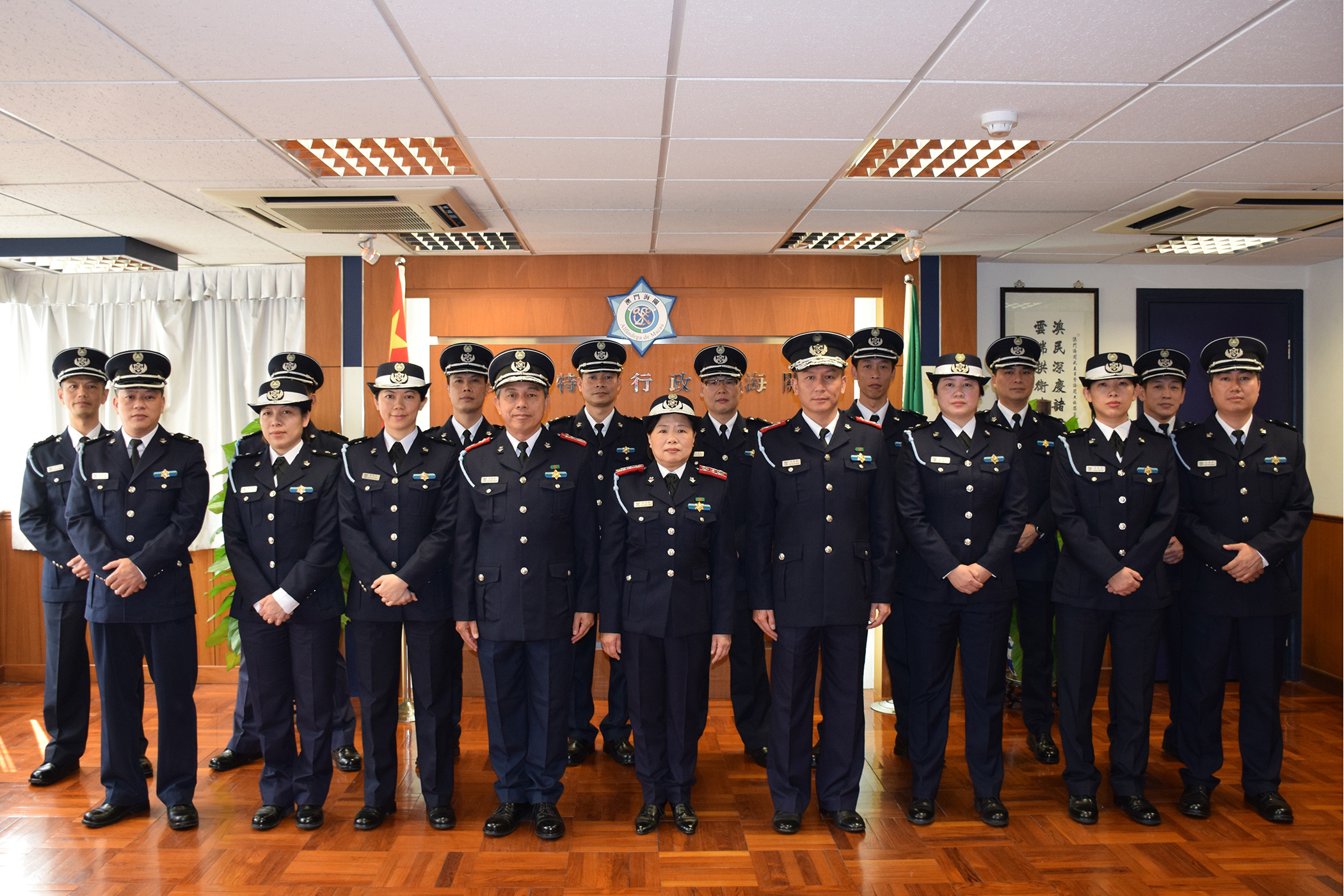 澳門海關於今日早上在海關總部舉行晉升關務督察的就職儀式,由賴敏華關長主持。今次共有14名副關務督察晉升為關務督察,分別為10男4女,有關人員是完成一個為期約11個星期且具淘汰性的培訓課程後獲得晉升。賴敏華關長在儀式中勉勵獲晉升的關務督察需繼續在工作中學習及進修,以提高自身的素質去面對新的工作挑戰,為部門及市民提供優質服務。其他出席官員包括冼桓球助理關長、吳國慶助理關長及廳長級官員等。
