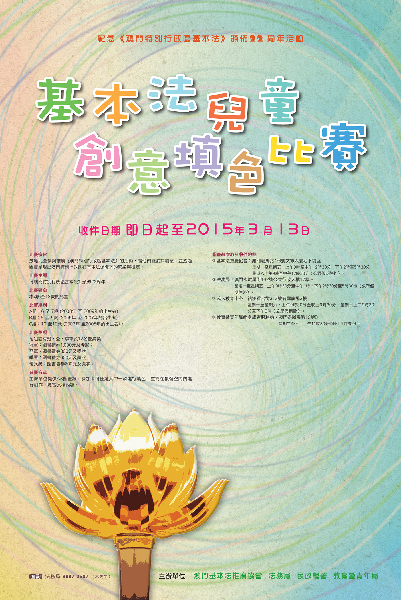 “基本法兒童創意填色比賽”對象為本澳六至十二歲的兒童,共分三個組別,包括A組六至七歲(二零零八年至二零零九年出生);B組八至九歲(二零零六年至二零零七年出生)及C組十至十二歲(二零零三年至二零零五年出生),每組設冠、亞、季軍各一名及優異獎十二名,冠、亞、季軍分別可獲得圖書禮券一千元、八百元、六百元及獎狀一張,優異獎可獲得圖書禮券二百元及獎狀一張。