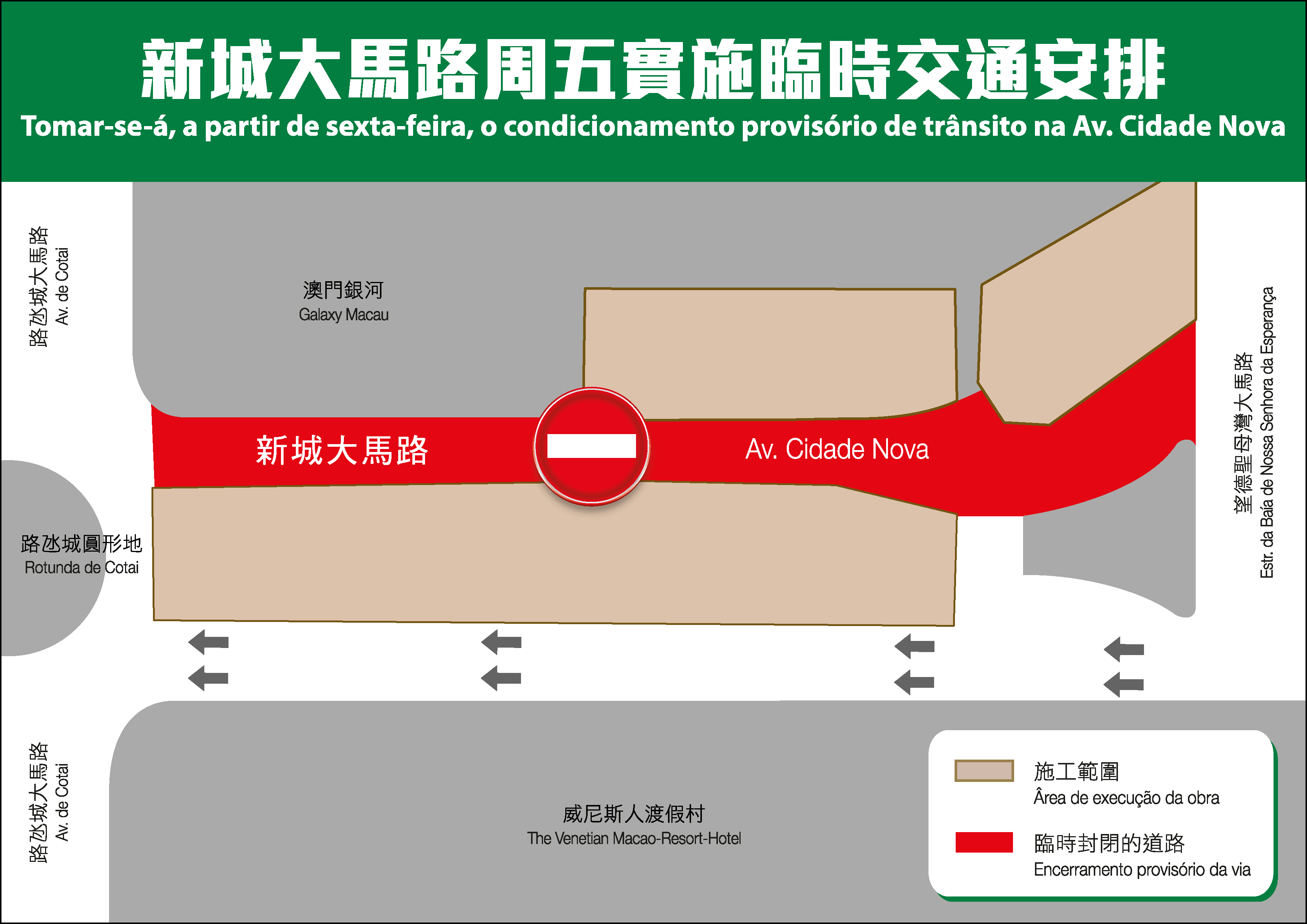 配合輕軌氹仔線的高架橋門架建設工作,周五(20日)起一連兩日晚上10時至翌日早上6時,介乎路氹圓形地與望德聖母灣大馬路之間的一段新城大馬路(靠近澳門銀河一側)實施臨時封閉。運輸基建辦公室及交通事務局期望透過非繁忙時段的施工安排,減低對居民出行及交通的影響。