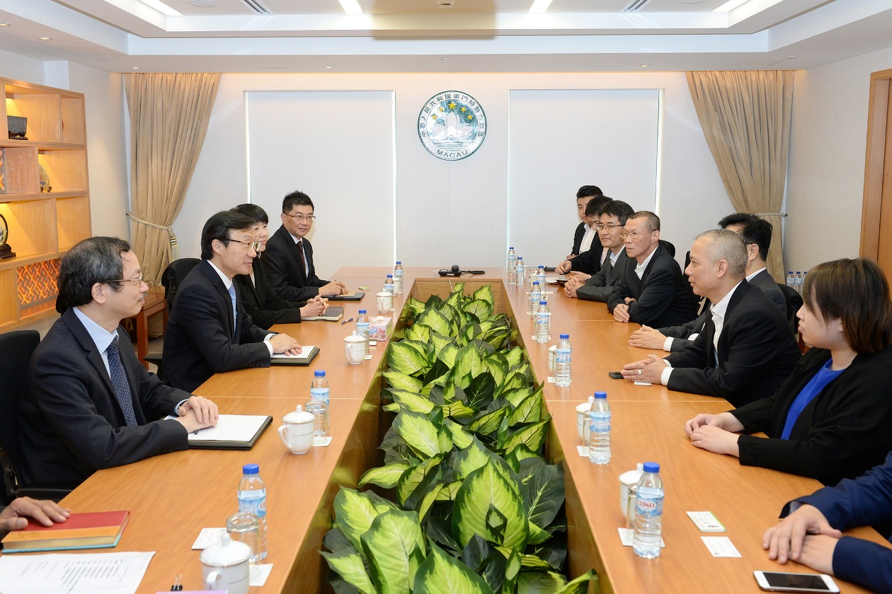 社會文化司司長譚俊榮3月20日在特區政府總部會見民衆建澳聯盟榮譽主席吳在權、理事長陳德勝等一行,就社會文化範疇的施政聽取意見。