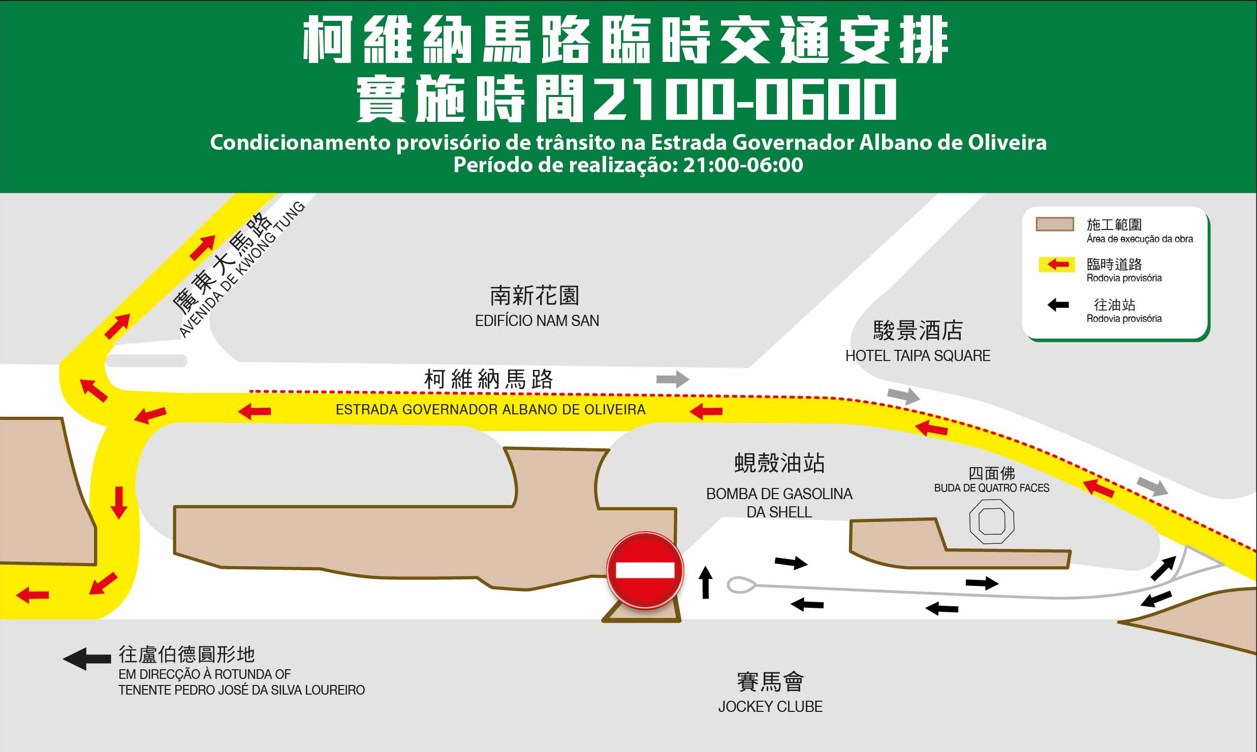 輕軌高架橋門架的建造分搭建門架支撐、安裝模板、澆灌混凝土及拆卸模板多個工序。為施工期間的公眾安全,介乎蜆殼油站與廣東大馬路之間的一段柯維納馬路(往盧伯德圓形地方向),周三(1日)起每個晚上9時至翌日上午6時實施封閉交通,預計為期兩晚。其間,介乎四面佛至蜆殼油站之間的一段列作無出口道路,前往蜆殼油站的路段維持車輛通行;而介乎佛山街與廣東大馬路之間的路段(往運動場圓形地方向)則實施雙向行車,車輛可以維持使用上述路段前往盧伯德圓形地或右轉入廣東大馬路行駛。