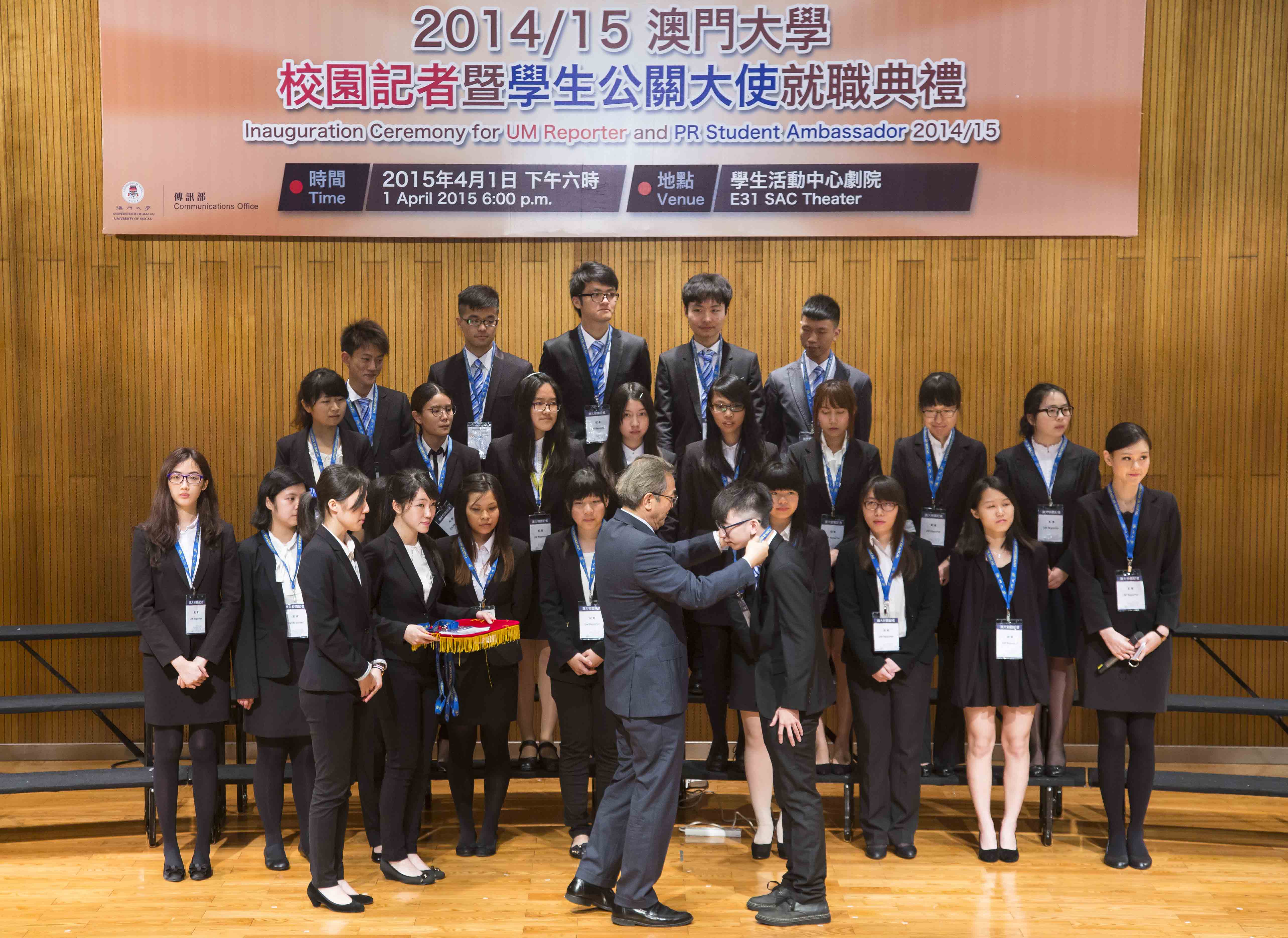 儀式上,程海東向新一屆的澳大校園記者和學生公關大使頒發記者證和名牌,傳訊總監張惠琴也向2013/2014年度十大傑出學生公關大使頒發證書。儀式上還回顧了歷屆學生的優秀作品、接待訪客和出外交流學習的片段,校園記者和學生公關大使等代表也分別上台分享經驗。現場有學生的精彩表現和大抽獎,氣氛熱鬧溫馨。
