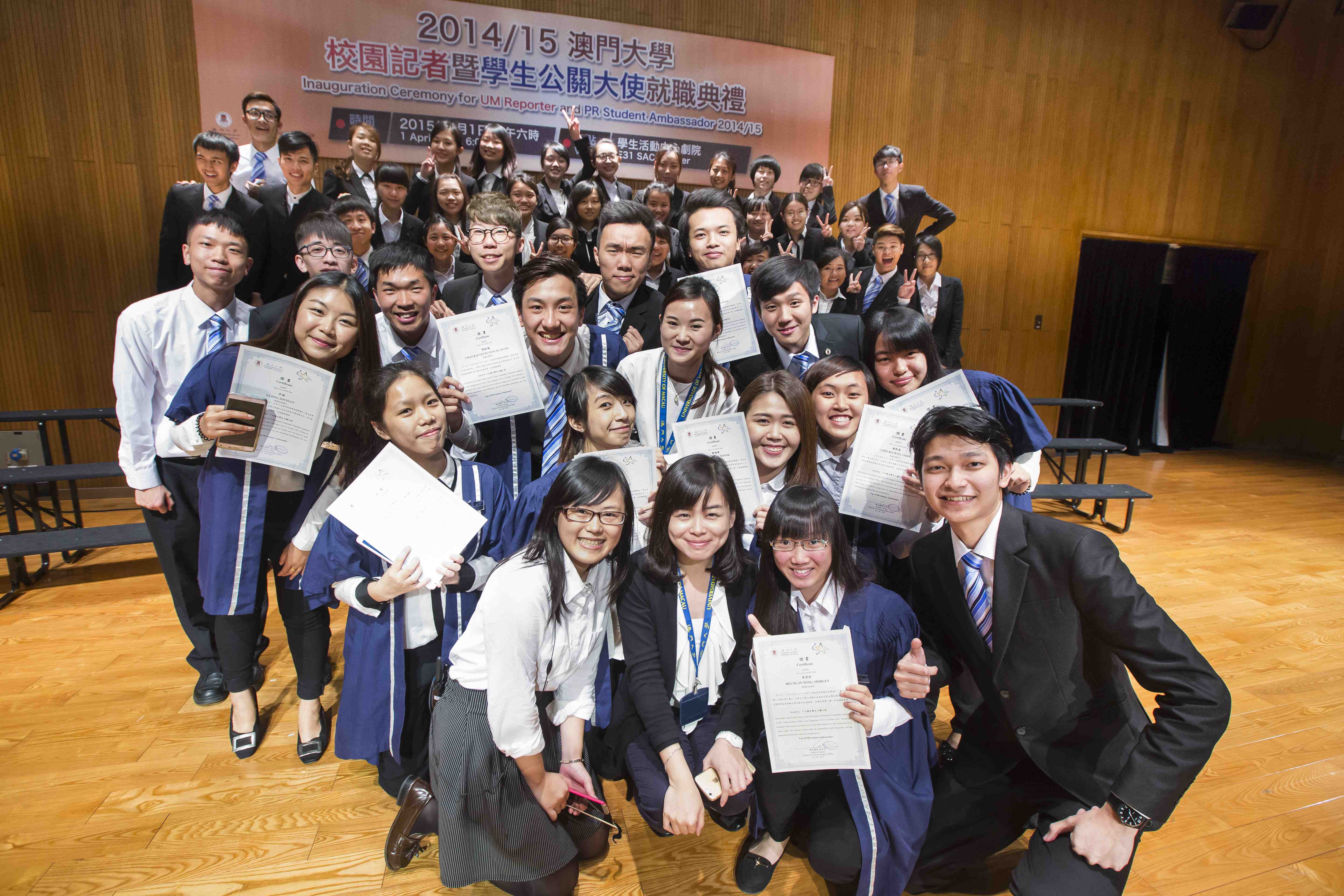 澳門大學校園記者暨學生公關大使就職典禮日前於澳大學生中心圓滿舉行。兩項計劃配合澳大“四位一體”教育模式中的“社群教育”,讓學生透過自主策劃和行動,達到自我學習和成長的目的。計劃培養了一批對校園充滿歸屬感的優秀校園記者、導賞和公關人才,為澳大樹立積極的校園文化。