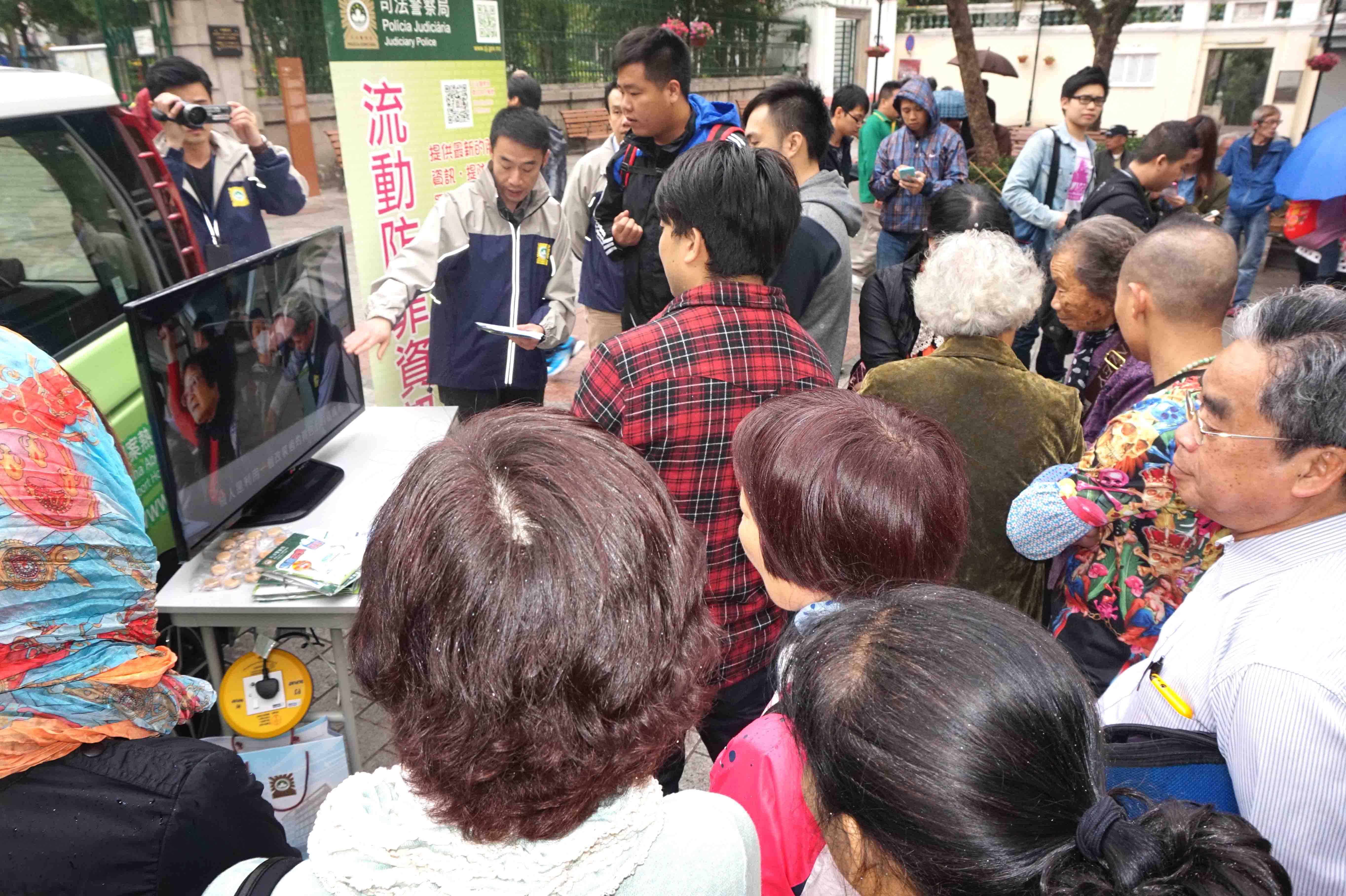 為貫徹和落實社區警務及主動警務的理念,司法警察局推出流動防罪資訊站,輪流於本澳各區公園、休憩區設點進行防罪宣傳,加強警民互動交流,吸引不少市民趨前諮詢防罪訊息。