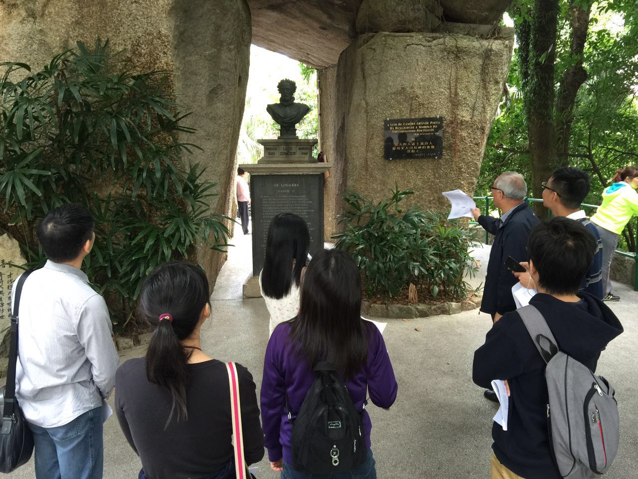 鄧景濱為澳門大學中文系榮休教授、澳門近代文學學會會長及澳門語言學會理事長,具豐富澳門楹聯研究經驗。鄧景濱深入淺出地講述蓮峰廟內牌匾和對聯的意思、格律及其背後故事,並從牌匾年份帶出蓮峰廟不同時期名稱的歷史,更詳細從古今文字演變及其意思深入解釋難以辨認的字體。在中西文化交匯的白鴿巢公園,鄧景濱介紹公園名稱由來,沿途逐一講解園內各副楹聯;亦於賈梅士洞介紹據說是當年葡萄牙詩人賈梅士創作《葡國魂》的情境,參加者興味盎然。