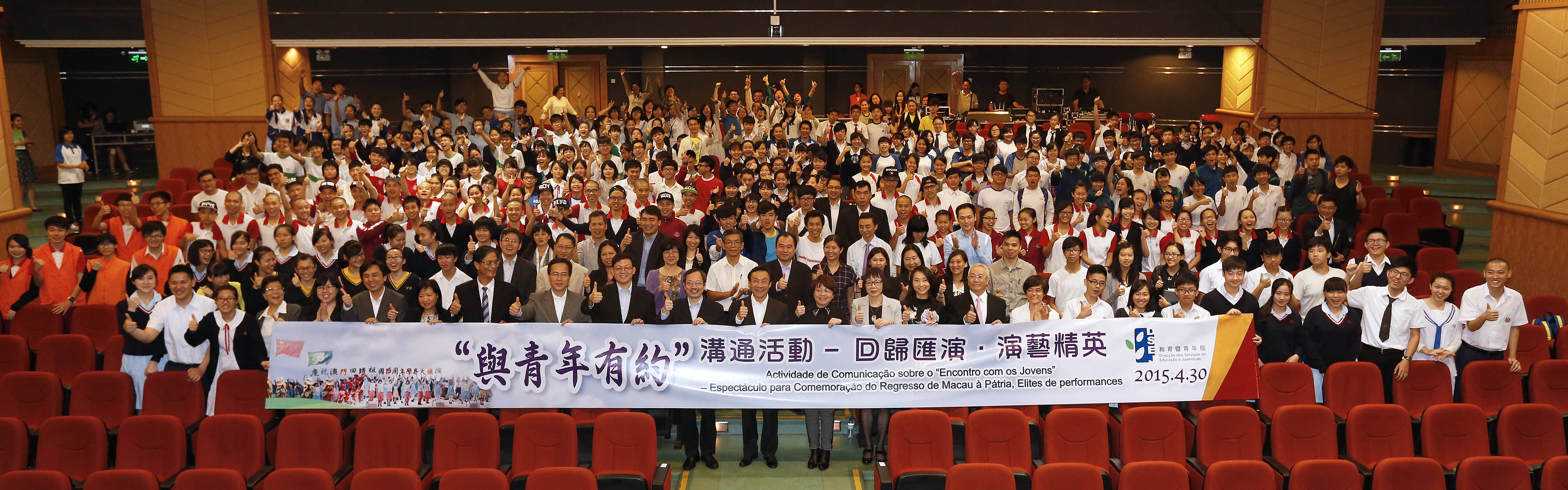 為了積極落實“廣開溝通渠道、激發青年潛能”的施政方針,增加青年參與公共事務的渠道和機會,教育暨青年局定期舉辦活動與不同領域的青年進行交流。4月30日教青局假濠江中學何賢堂舉辦“與青年有約”溝通活動——回歸匯演‧演藝精英座談會。透過活動加強與演藝青年的溝通互動,了解該領域青年人的想法及意見。社會文化司司長譚俊榮、社會文化司司長辦公室主任黎英杰及教青局局長梁勵,以及多位非高等教育委員會委員、青年事務委員會委員與到場的300多名學生進行了互動交流。