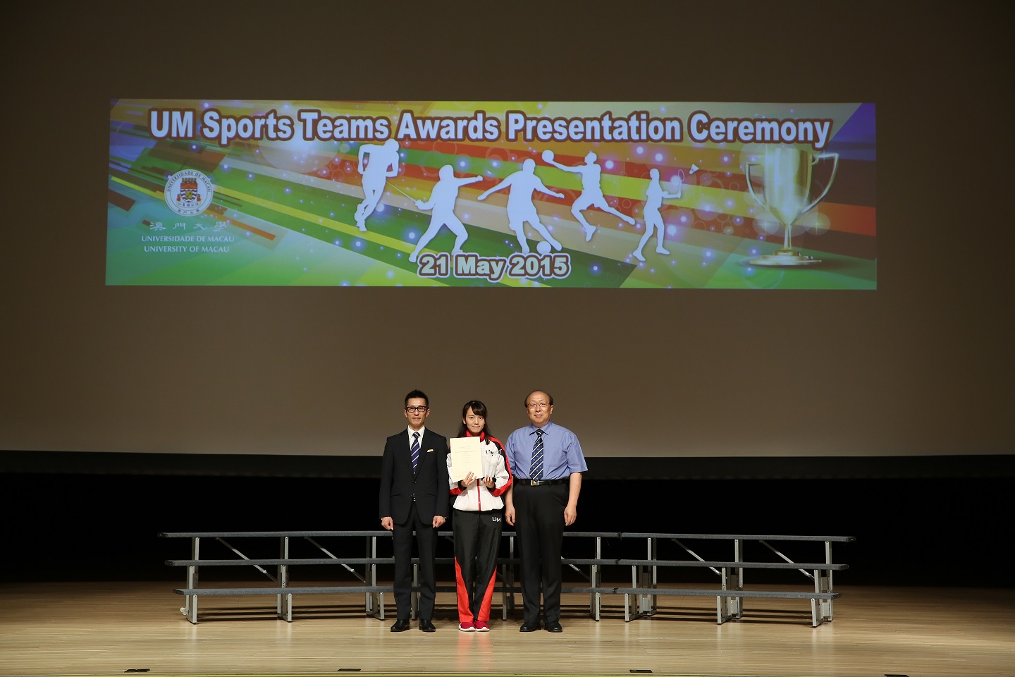 澳門大學昨(21)日於澳大大學會堂舉行了2014-2015年度運動獎項頒獎典禮,藉此表彰和鼓勵卓越的運動員及運動校隊。澳大校長趙偉教授出席支持並於頒獎台上與每位得獎運動員握手,冀望他們不斷挑戰自己,繼續在運動水平上有新的突破,為澳大增光。