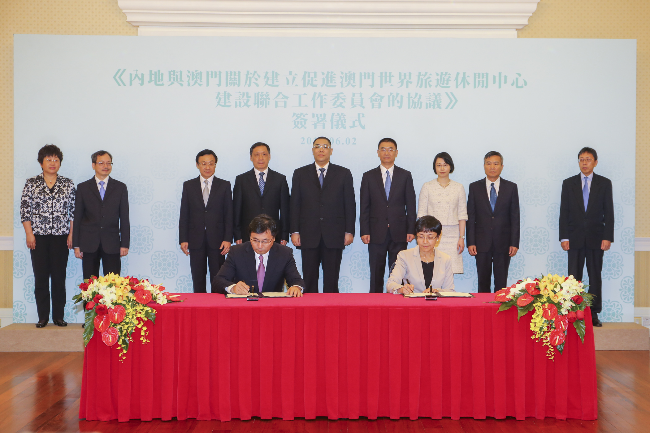 澳門特別行政區政府代表文綺華與國家旅遊局代表劉克智簽署《內地與澳門關於建立促進澳門世界旅遊休閒中心建設聯合工作委員會的協議》。
