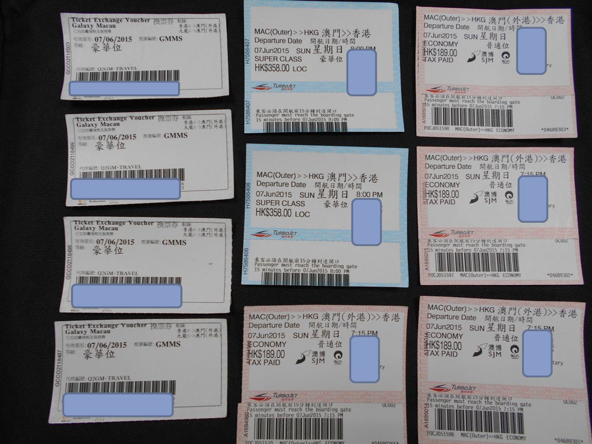 澳門海關關員在澳門外港碼頭,查獲兩名人士(一男一女) 涉嫌觸犯「交通客票之炒賣」罪,其中一名人士更涉嫌觸犯「使用及佔有他人證件」及「非法再入境」罪,海關人員故將兩人送交檢察院處理。