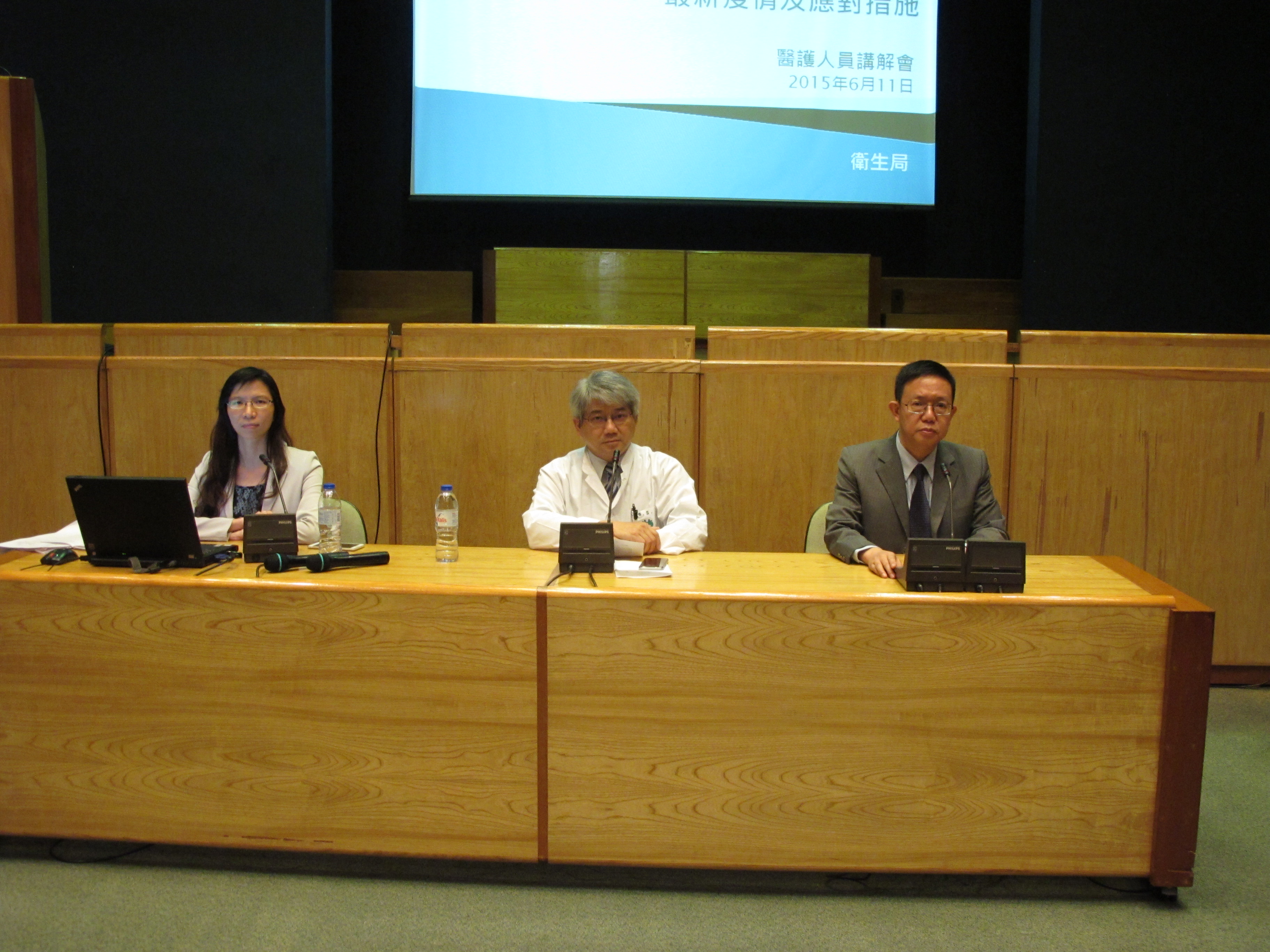 衛生局李展潤局長、疾病預防控制中心主任林松醫生、疾病預防控制中心傳染病防制暨疾病監測部協調員梁亦好醫生,向與會者講解目前中東呼吸道綜合徵的流行情況、通報、送檢流程、感染控制及防控措施。兩場講解會合共有約有350名醫護人員出席。