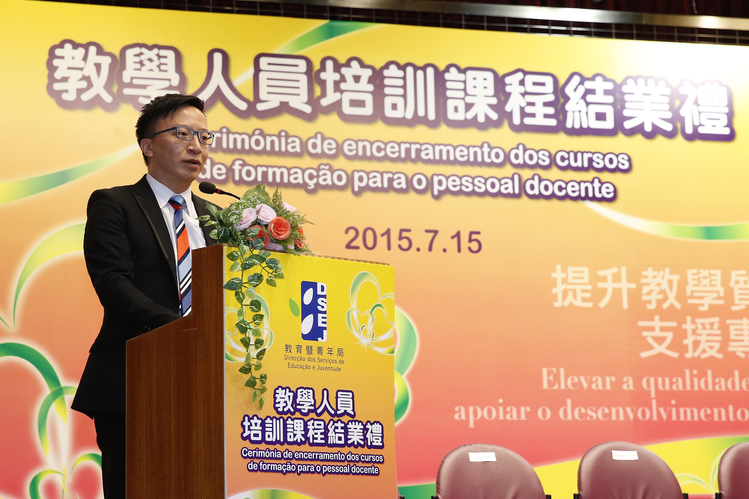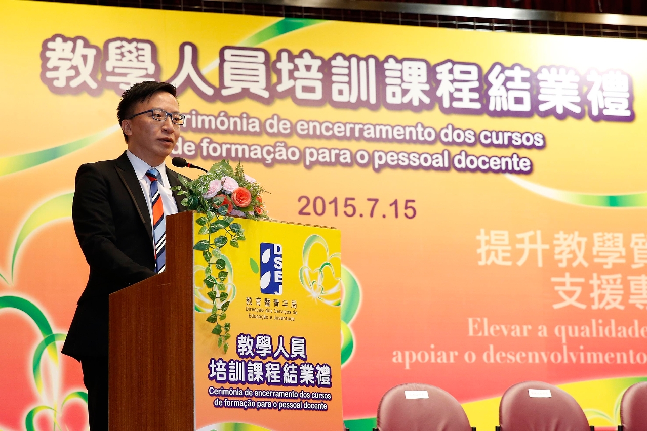 教育暨青年局2014/2015學年(截至7月1日)共舉辦了378項教學人員培訓活動,共5,001小時,提供了15,960名額。為了與教學人員共同分享完成培訓的碩果與喜悅,同時也藉此鼓勵教學人員持續進修,以及在教學改革工作方面多做貢獻,教青局於7月15日下午在聖羅撒英文中學禮堂隆重舉行了“教學人員培訓課程結業禮”。